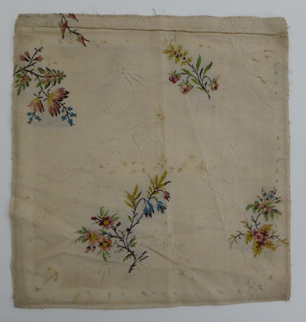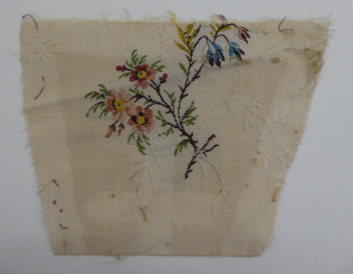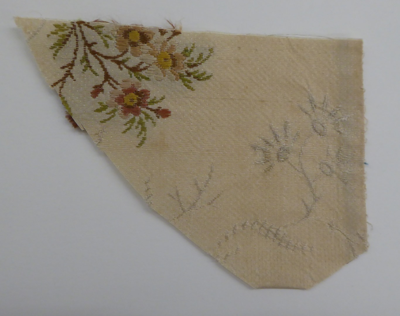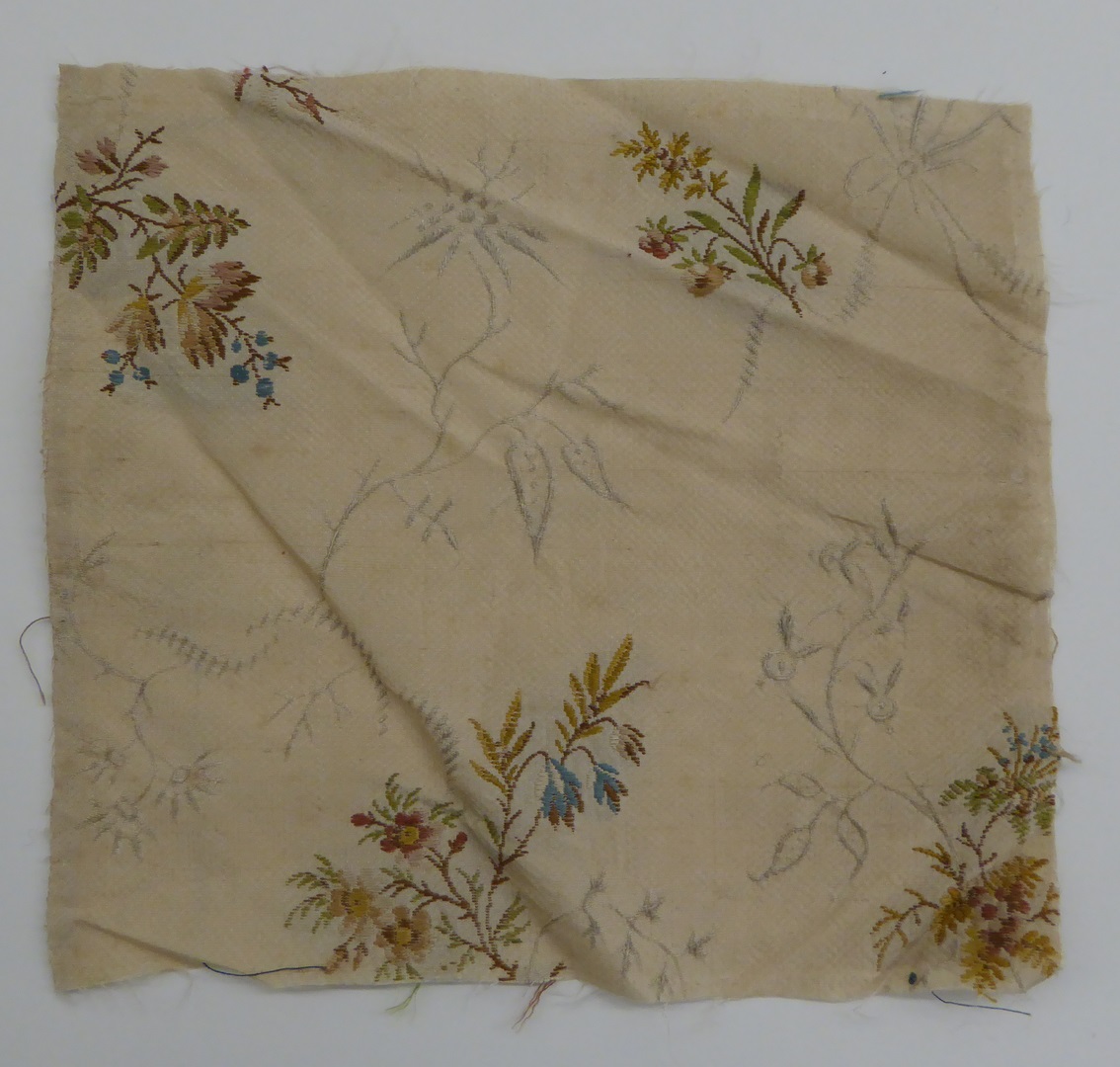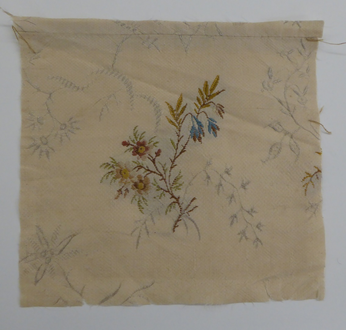 Crème brochéweefsel (17 fragmenten) met stippelpatroon, c-voluten en veelkleurige boeketten