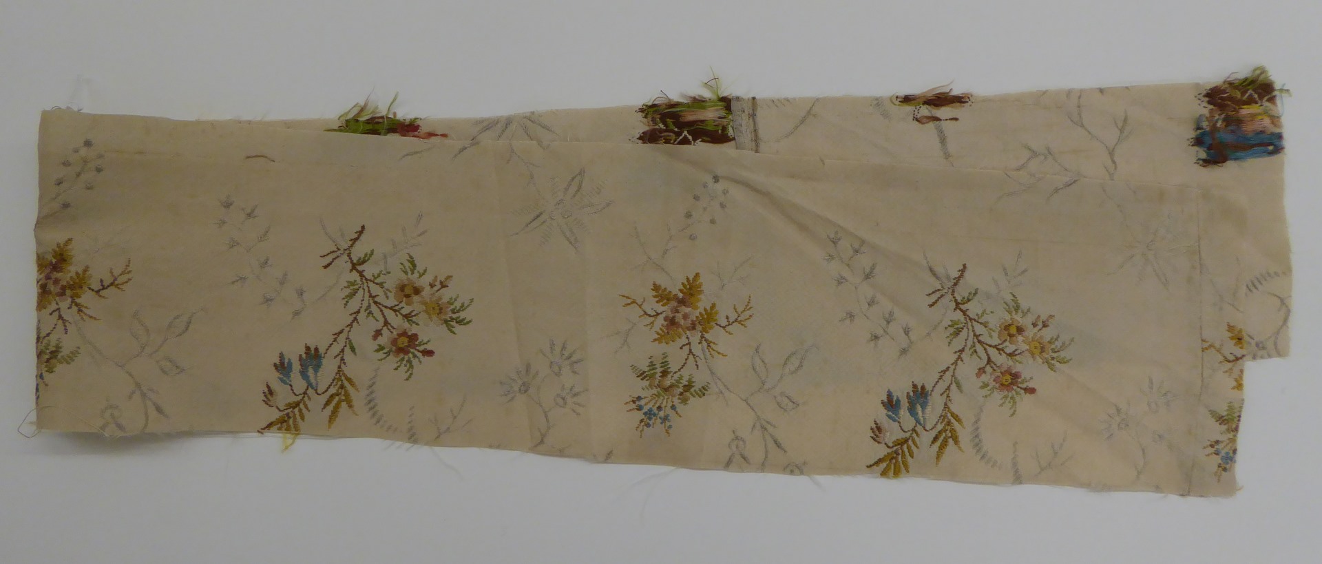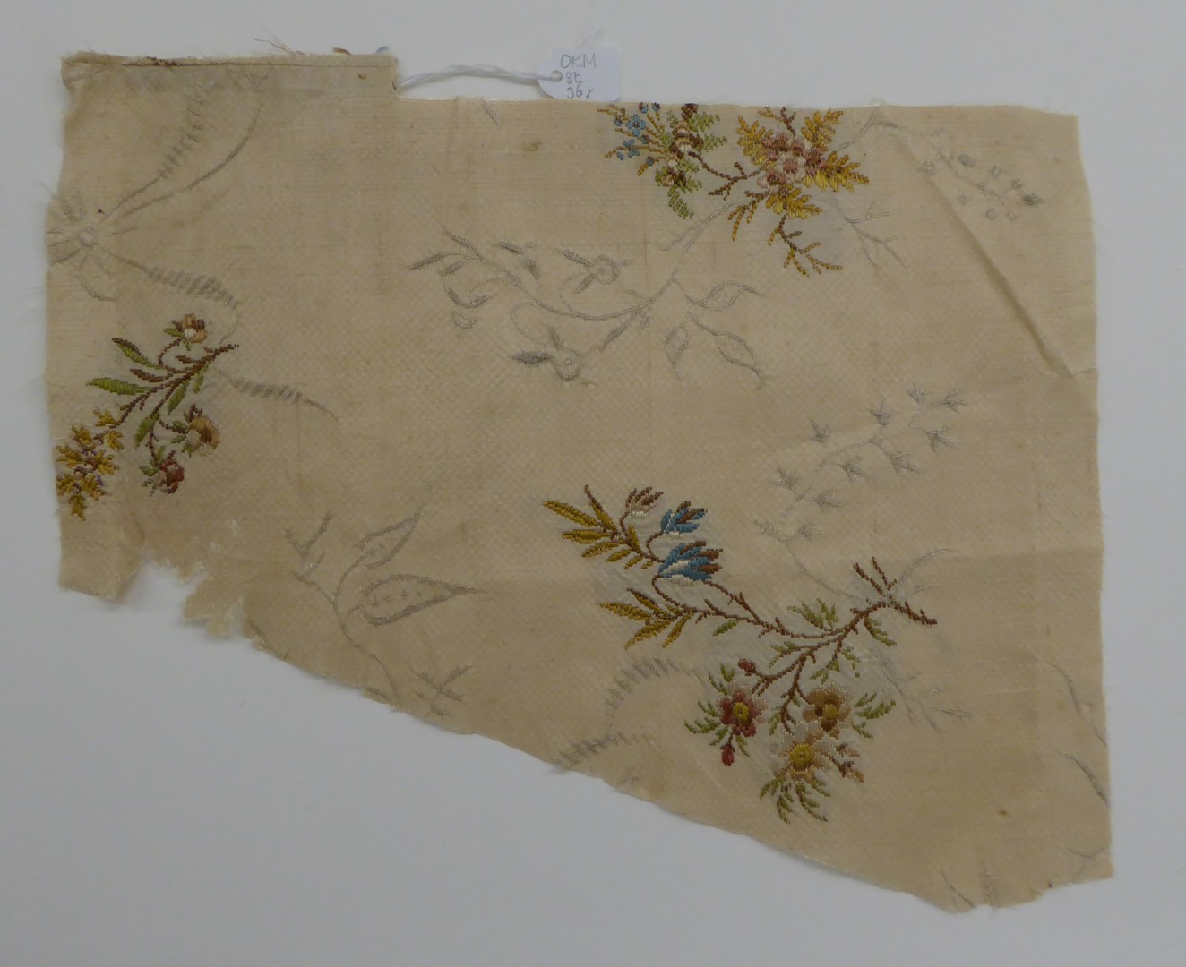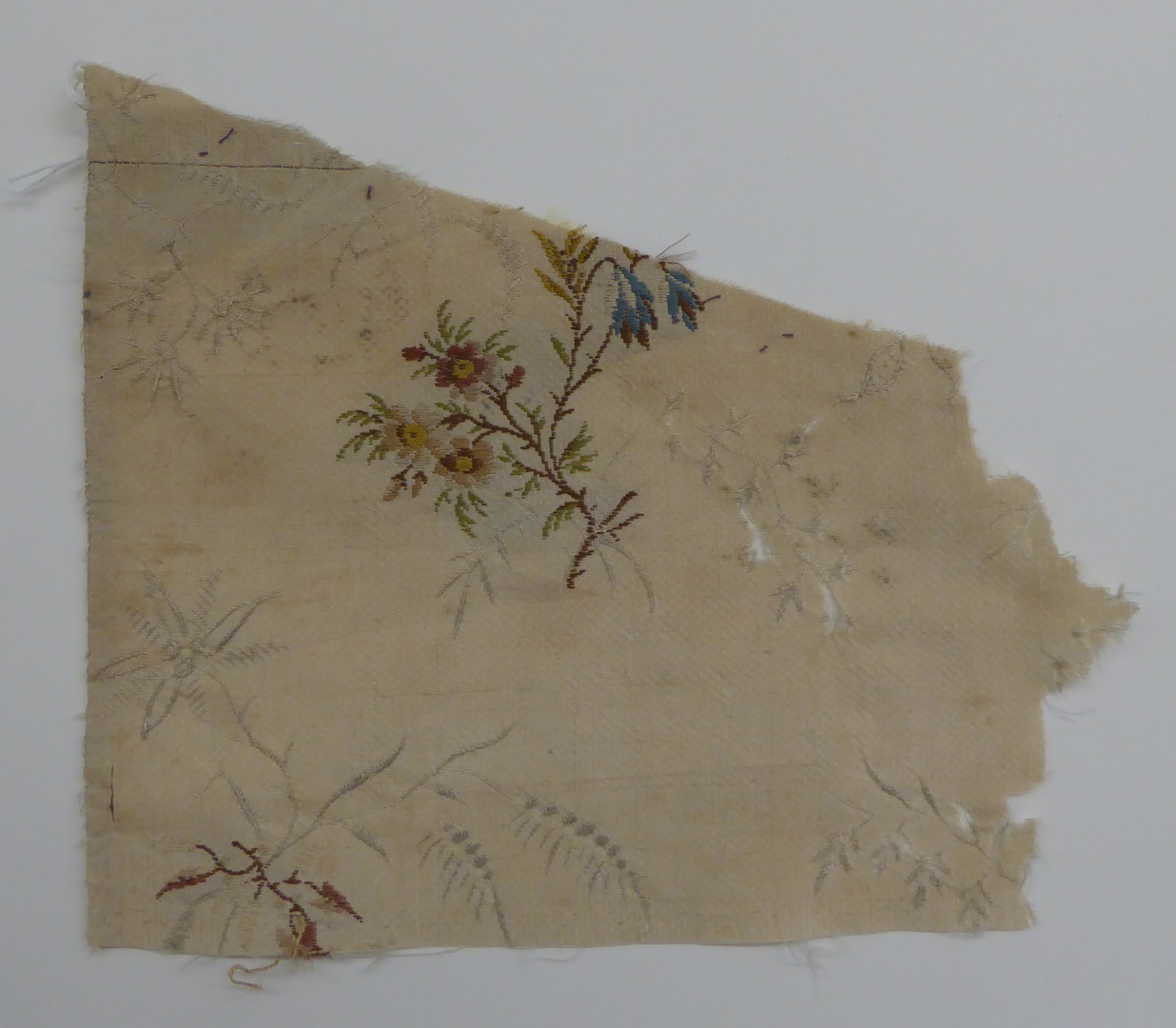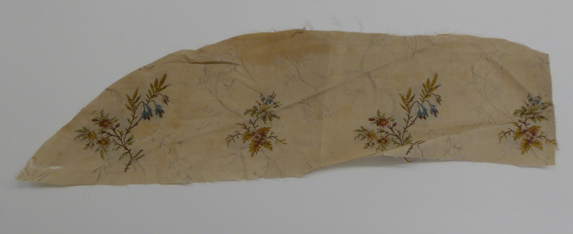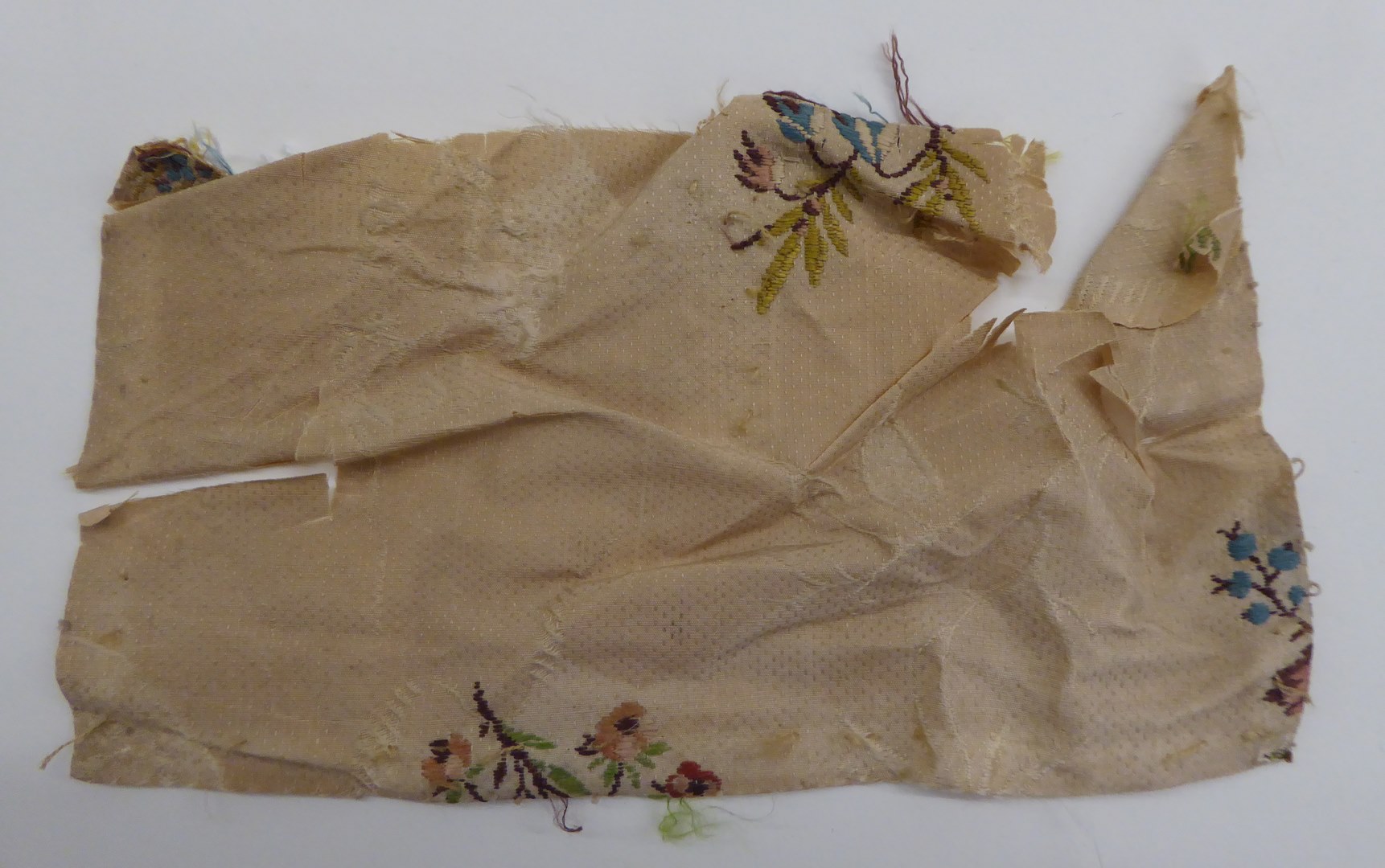 Crème brochéweefsel (17 fragmenten) met stippelpatroon, c-voluten en veelkleurige boeketten