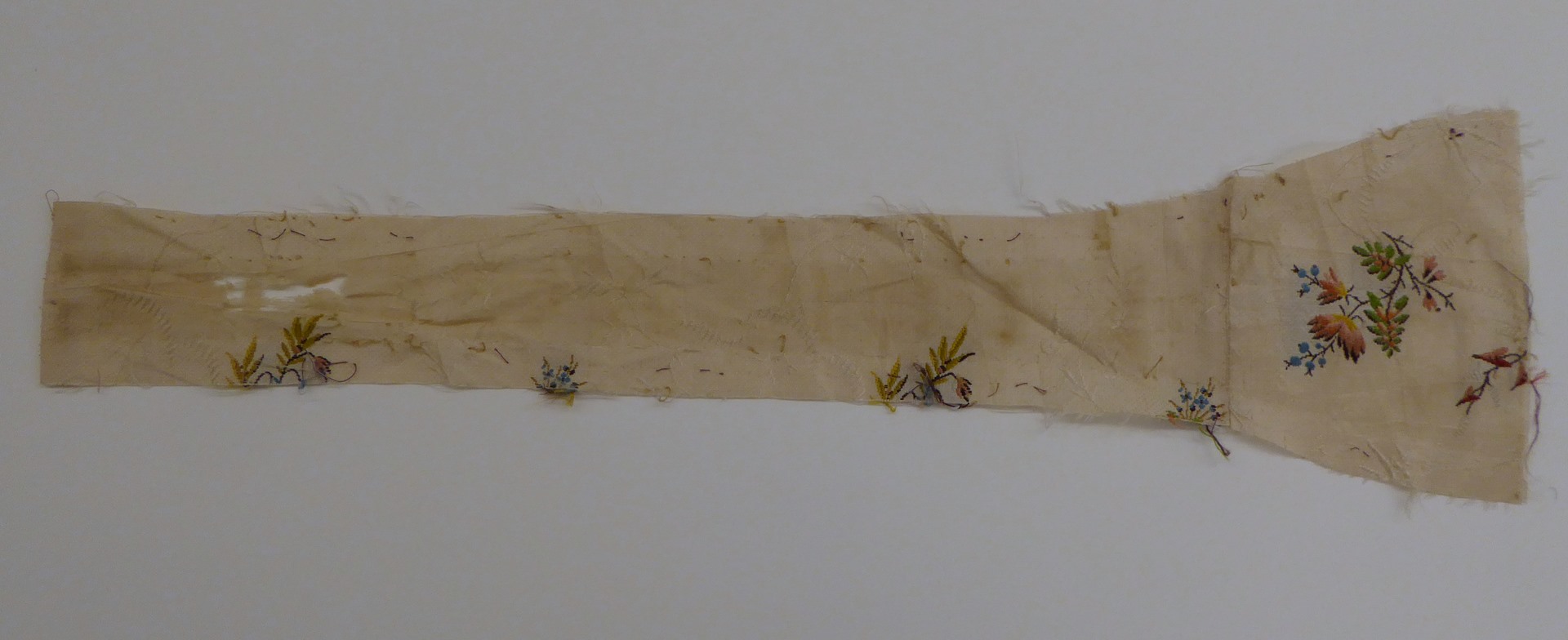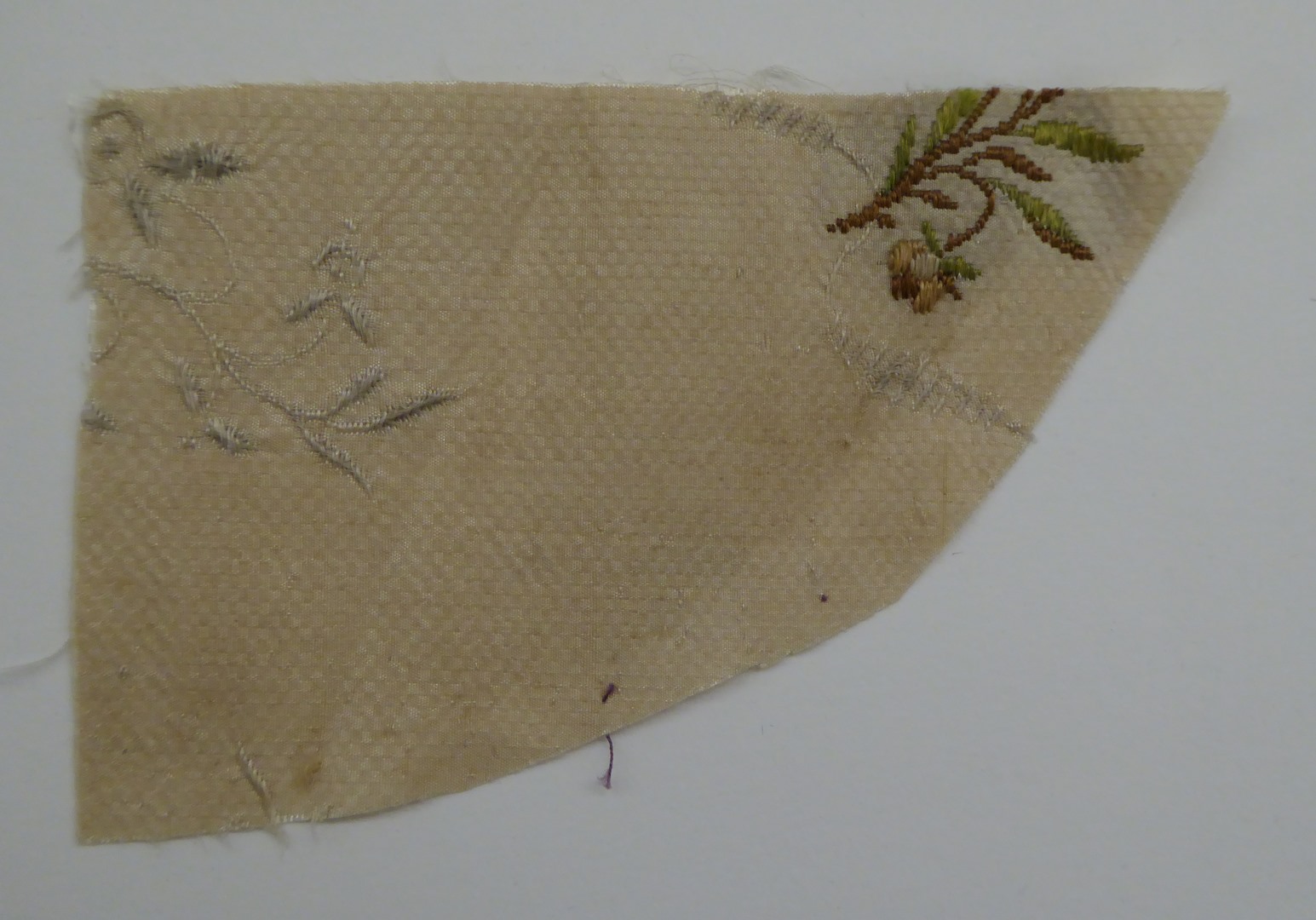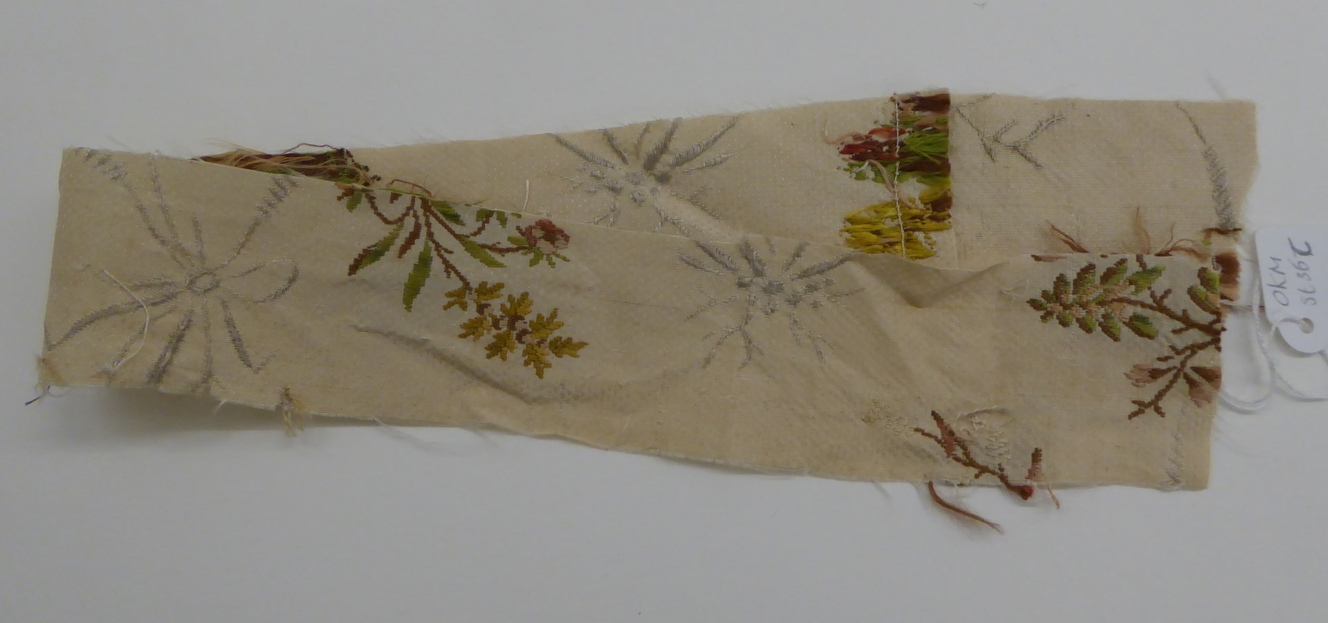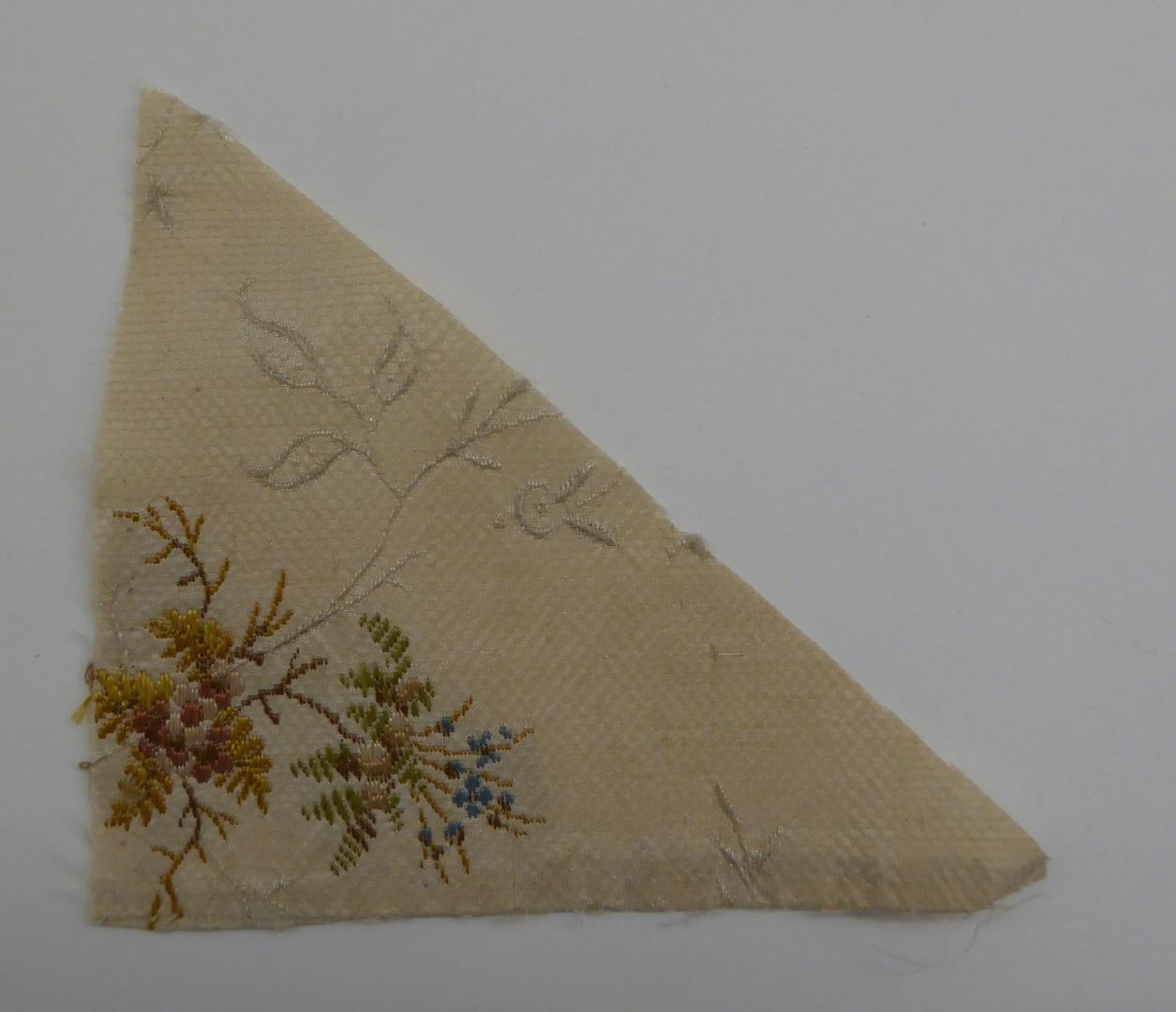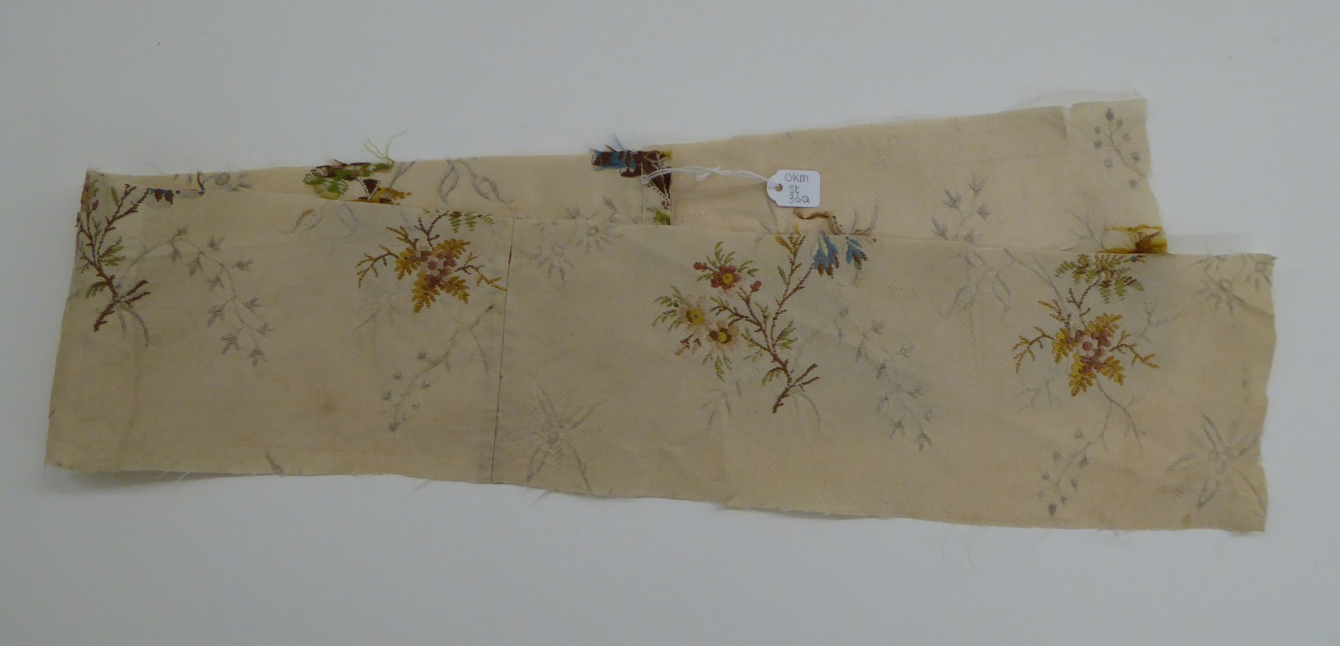 Crème brochéweefsel (17 fragmenten) met stippelpatroon, c-voluten en veelkleurige boeketten
