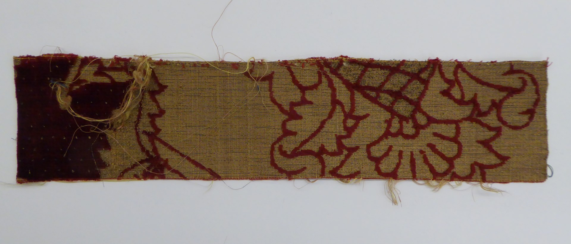 Goud fluweel, effen, gekruifd, met rode granaatappel- en plantenmotieven