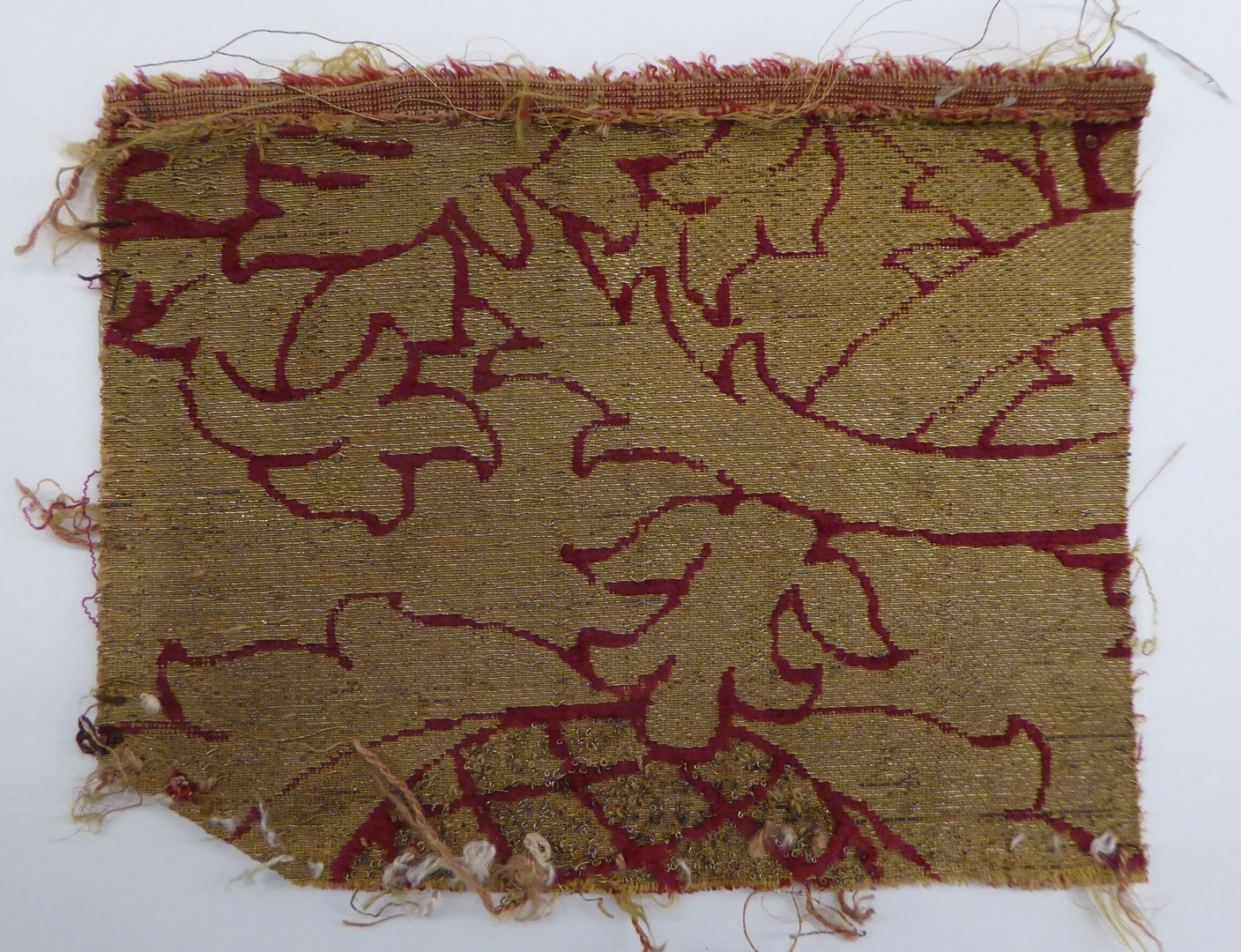 Goud fluweel, effen, gekruifd, met rode granaatappel- en plantenmotieven