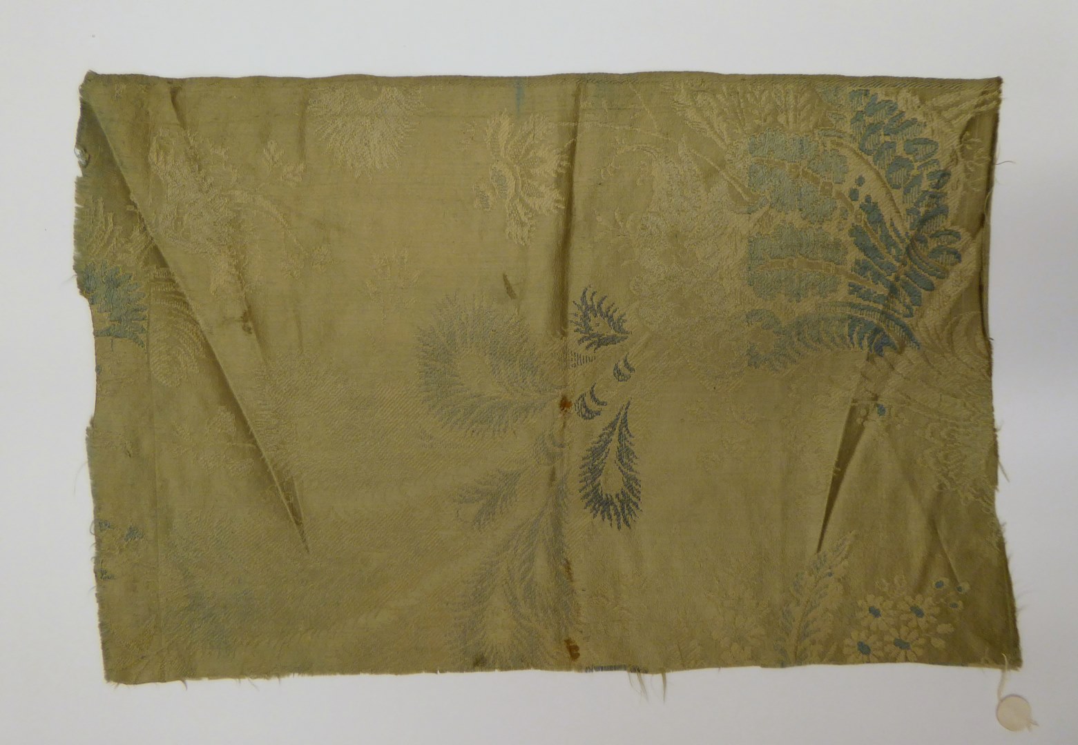 Blauw-groen zijdeweefsel met bloem-, blad- en pauwenveermotief