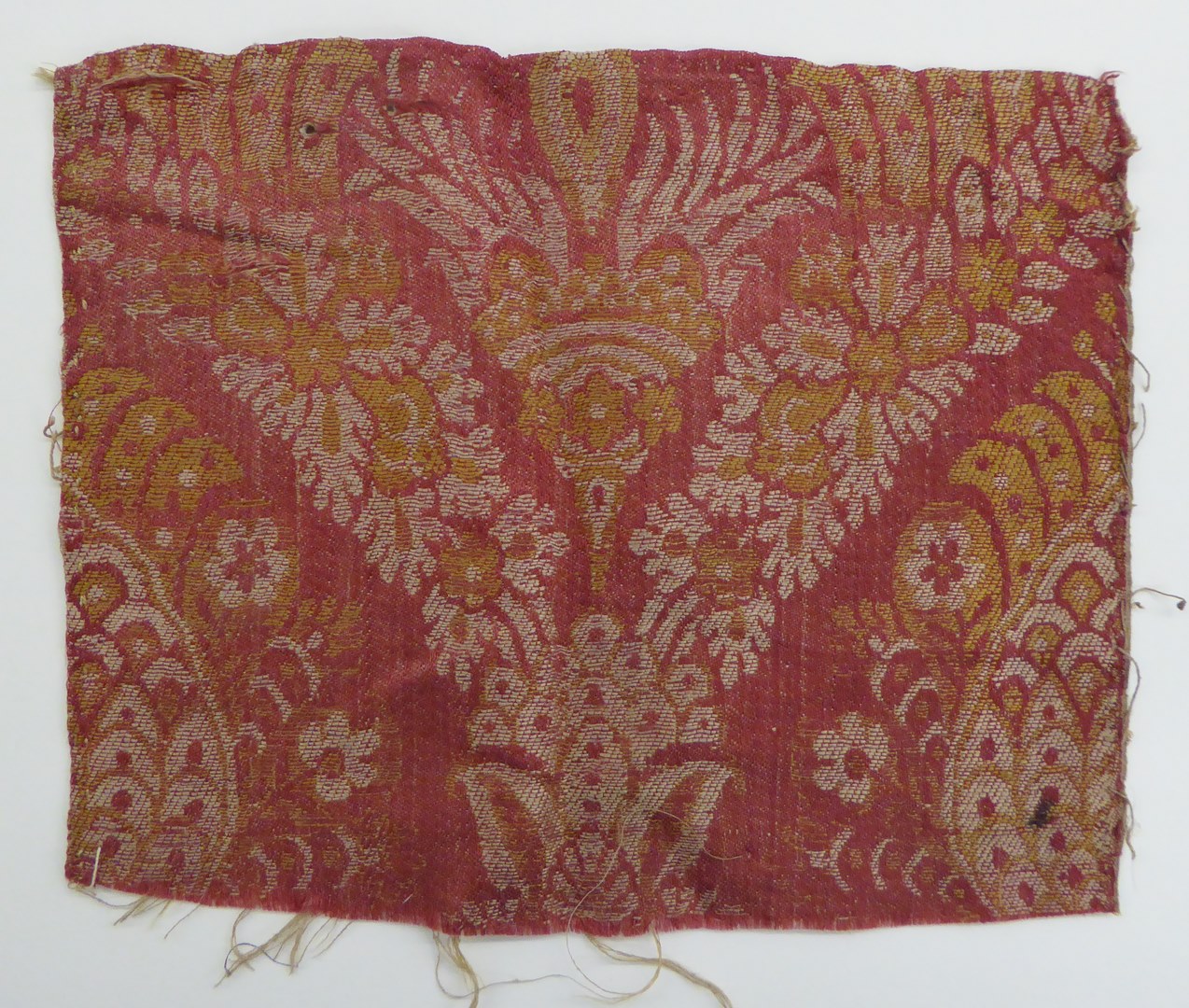 Roze zijdeweefsel met geel-wit patroon van kroon in granaatappels en bloemranken