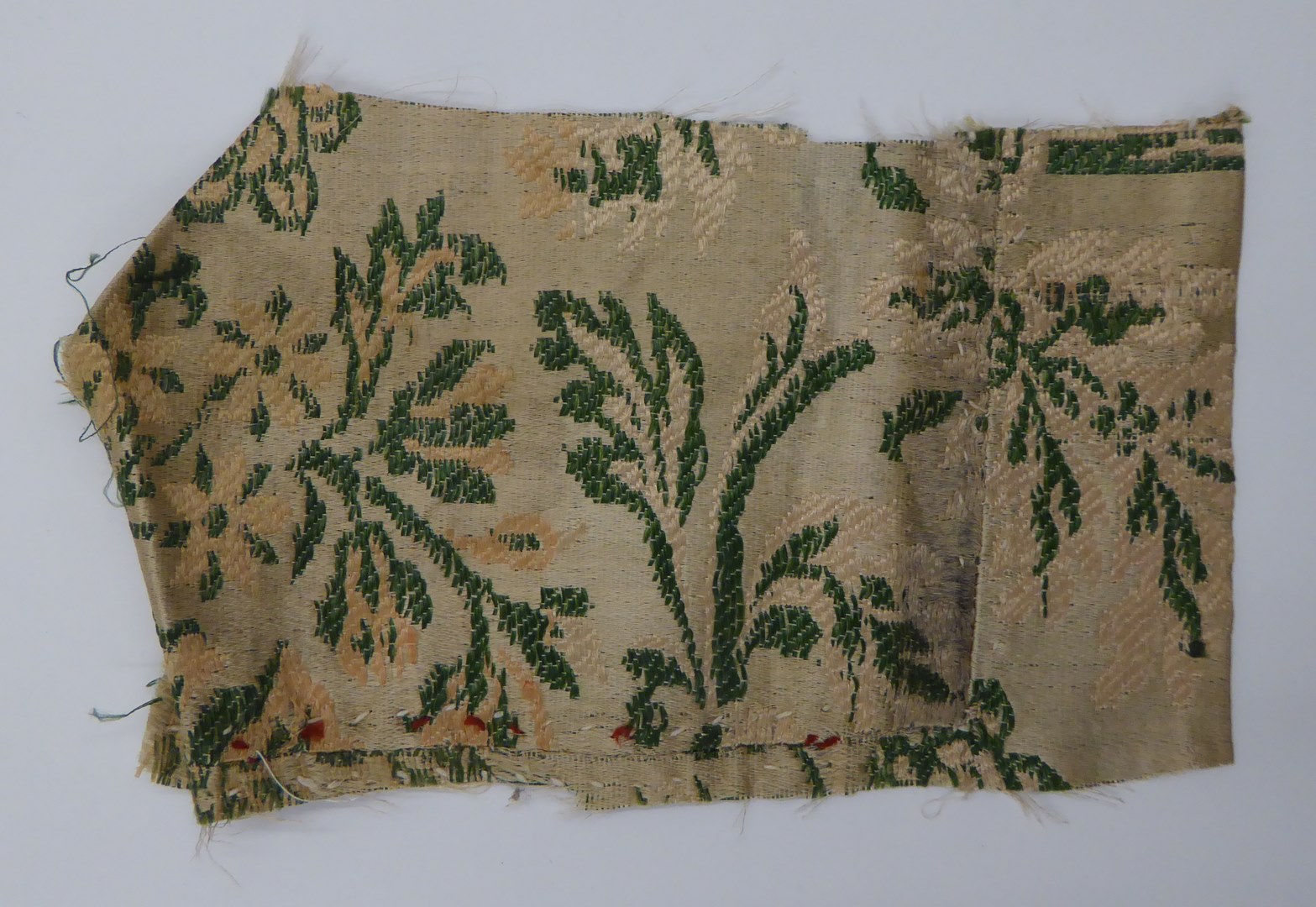 Crème liseréweefsel met groene en roze bloem-, strik- en granaatappelmotieven