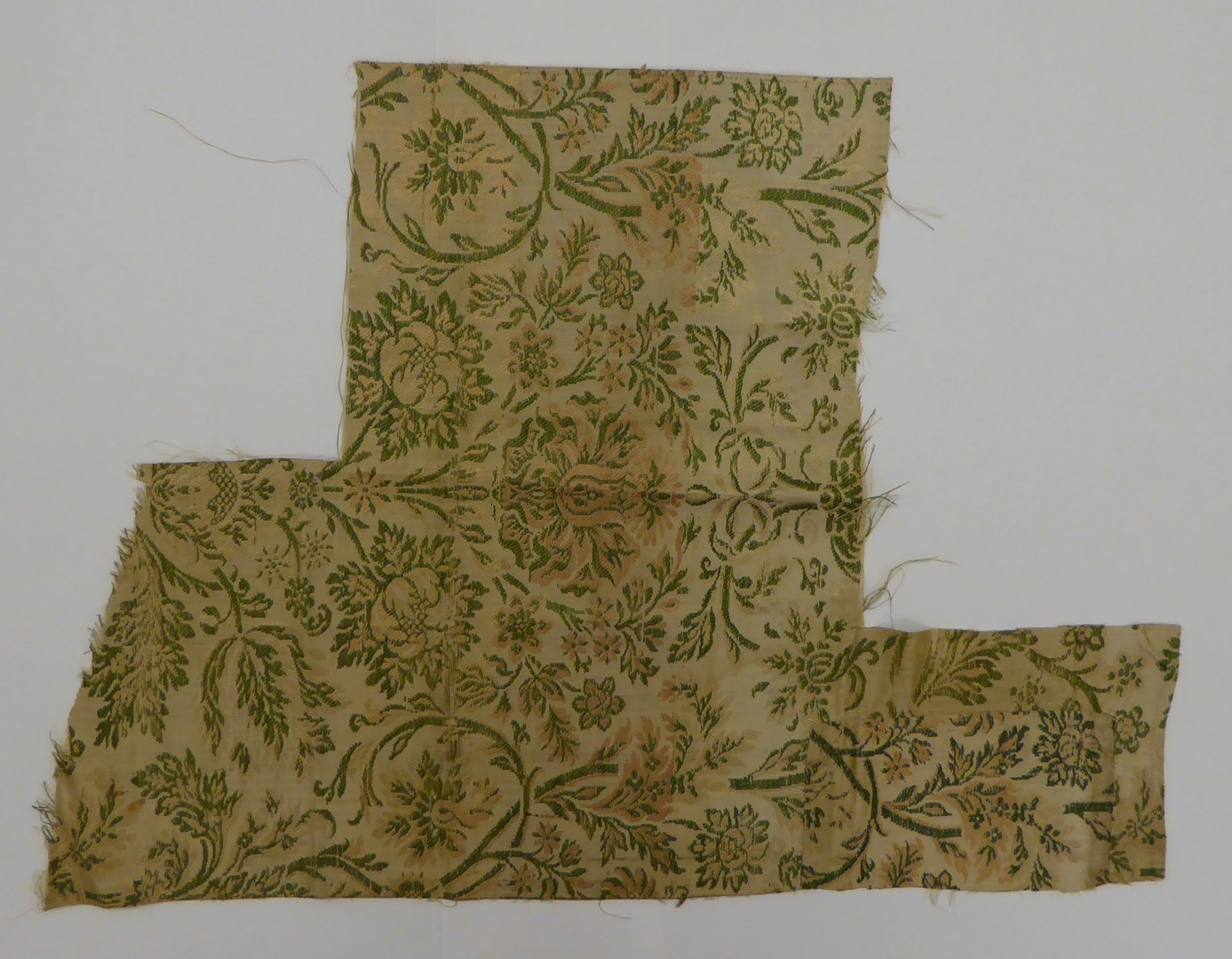 Crème liseréweefsel met groene en roze bloem-, strik- en granaatappelmotieven