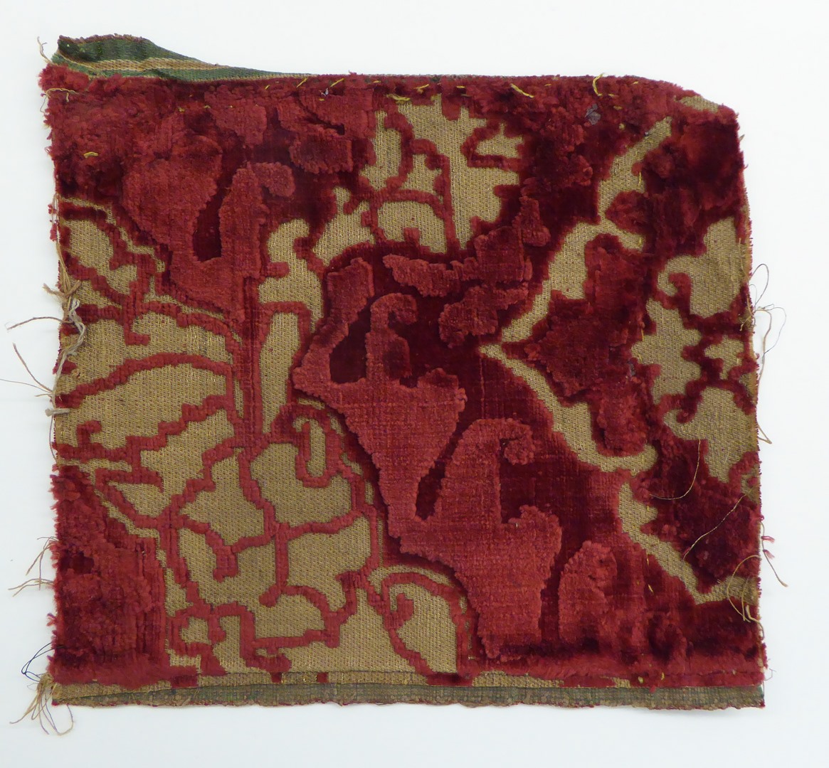 Goud fluweel, effen, gekruifd, met rode granaatappel- en plantenmotieven