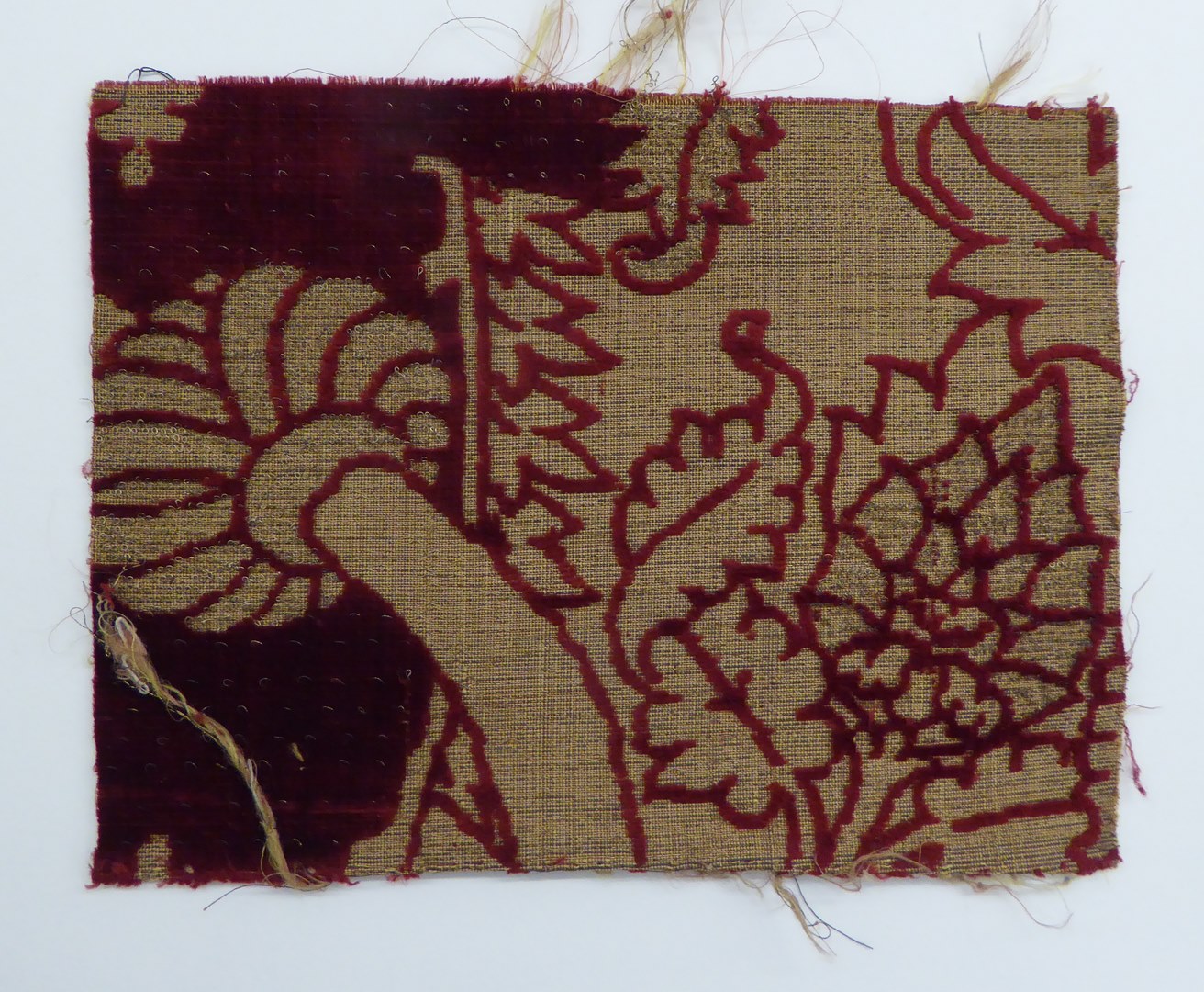 Goud fluweel, effen, gekruifd, met rode granaatappel- en plantenmotieven