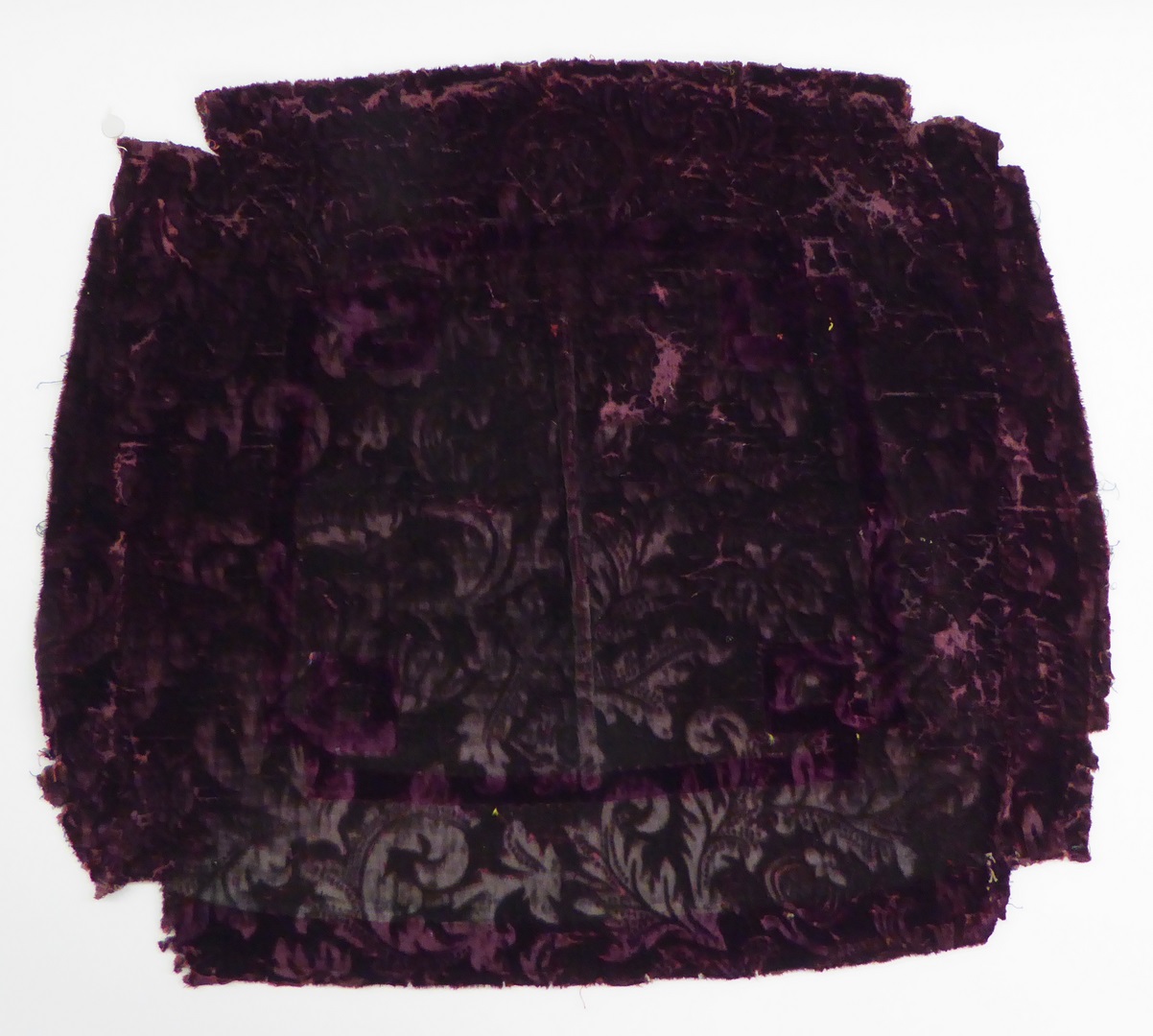 Paars fluweel met geperst patroon van gestileerde planten en granaatappels