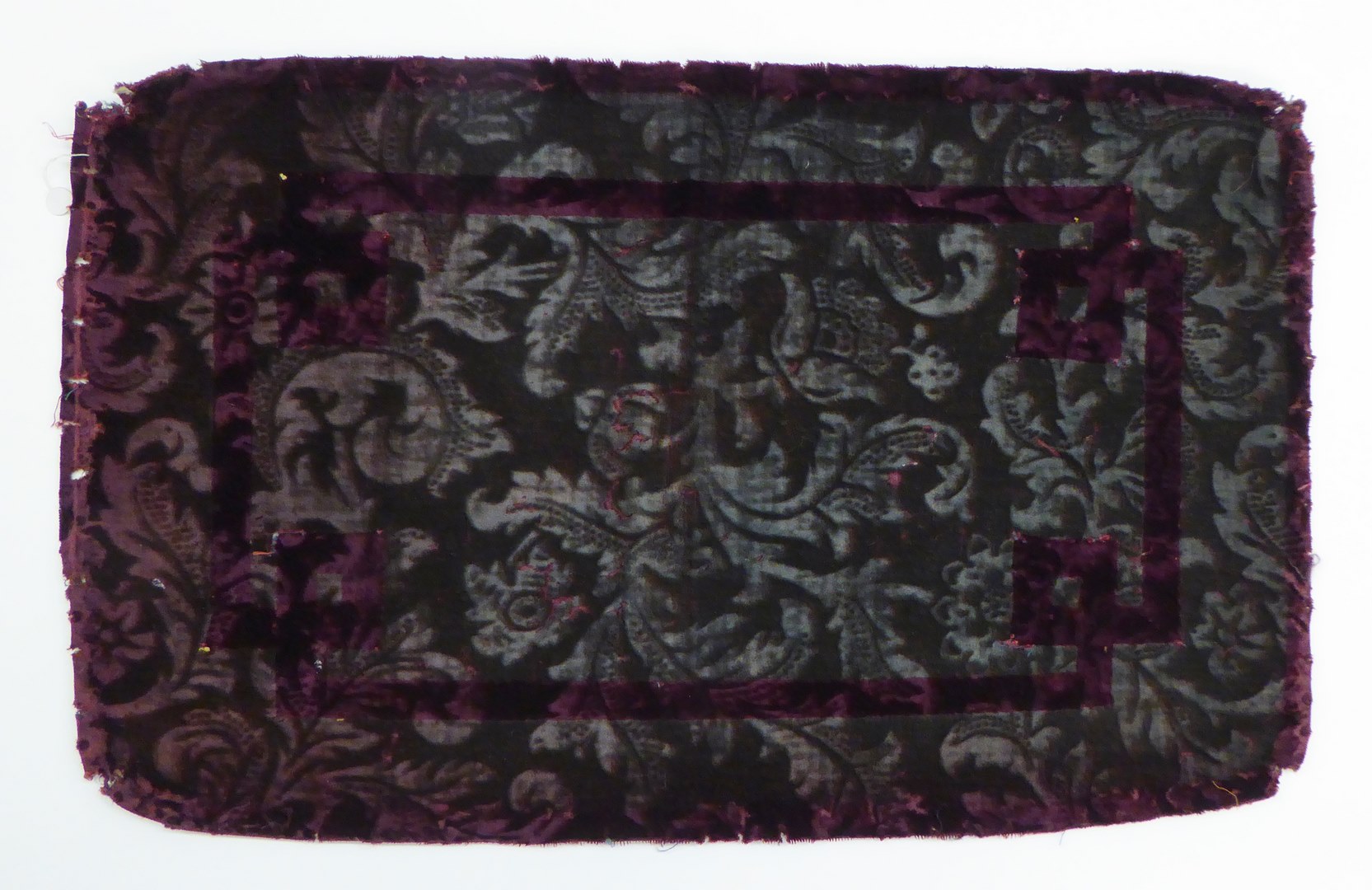 Paars fluweel met geperst patroon van gestileerde planten en granaatappels