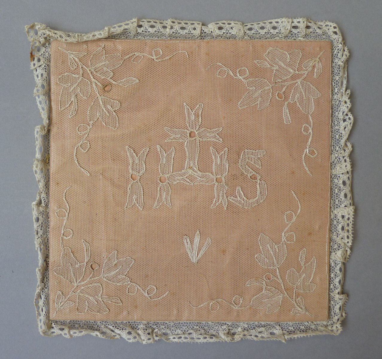Roze palla overtrokken met tule waarop IHS en druivenranken