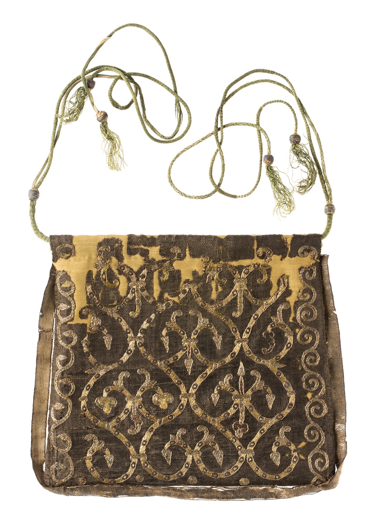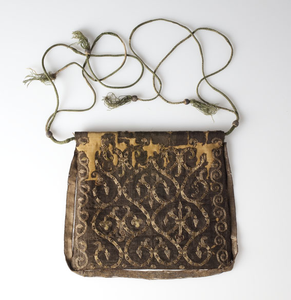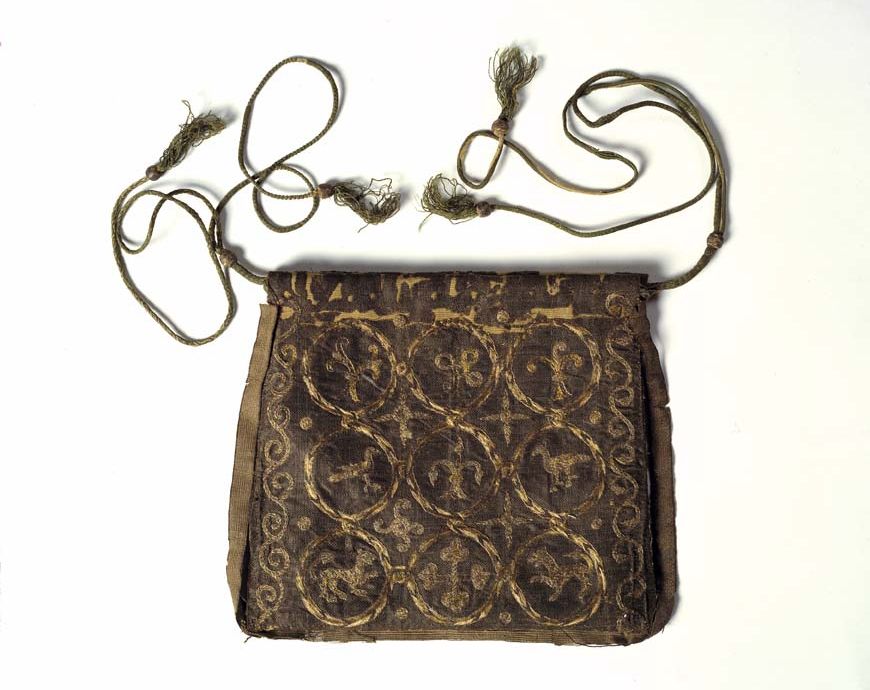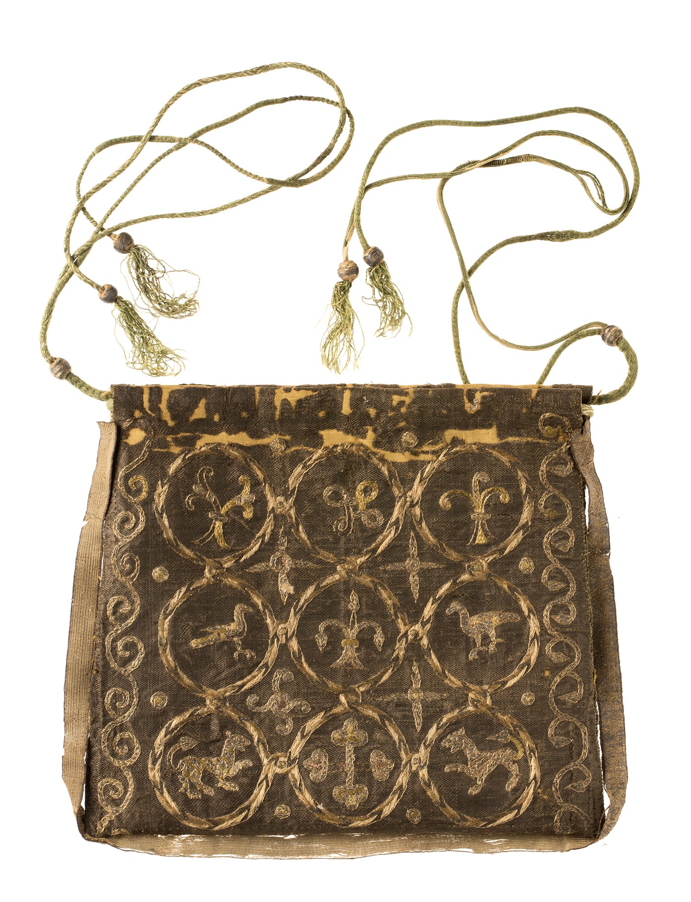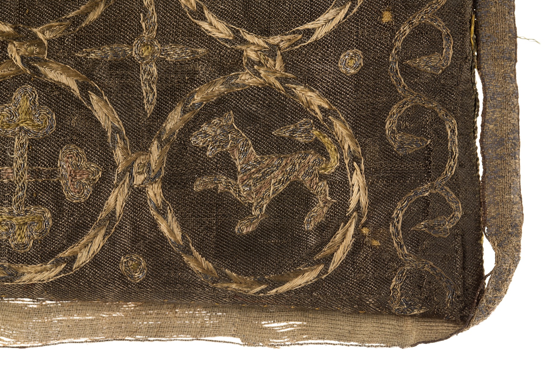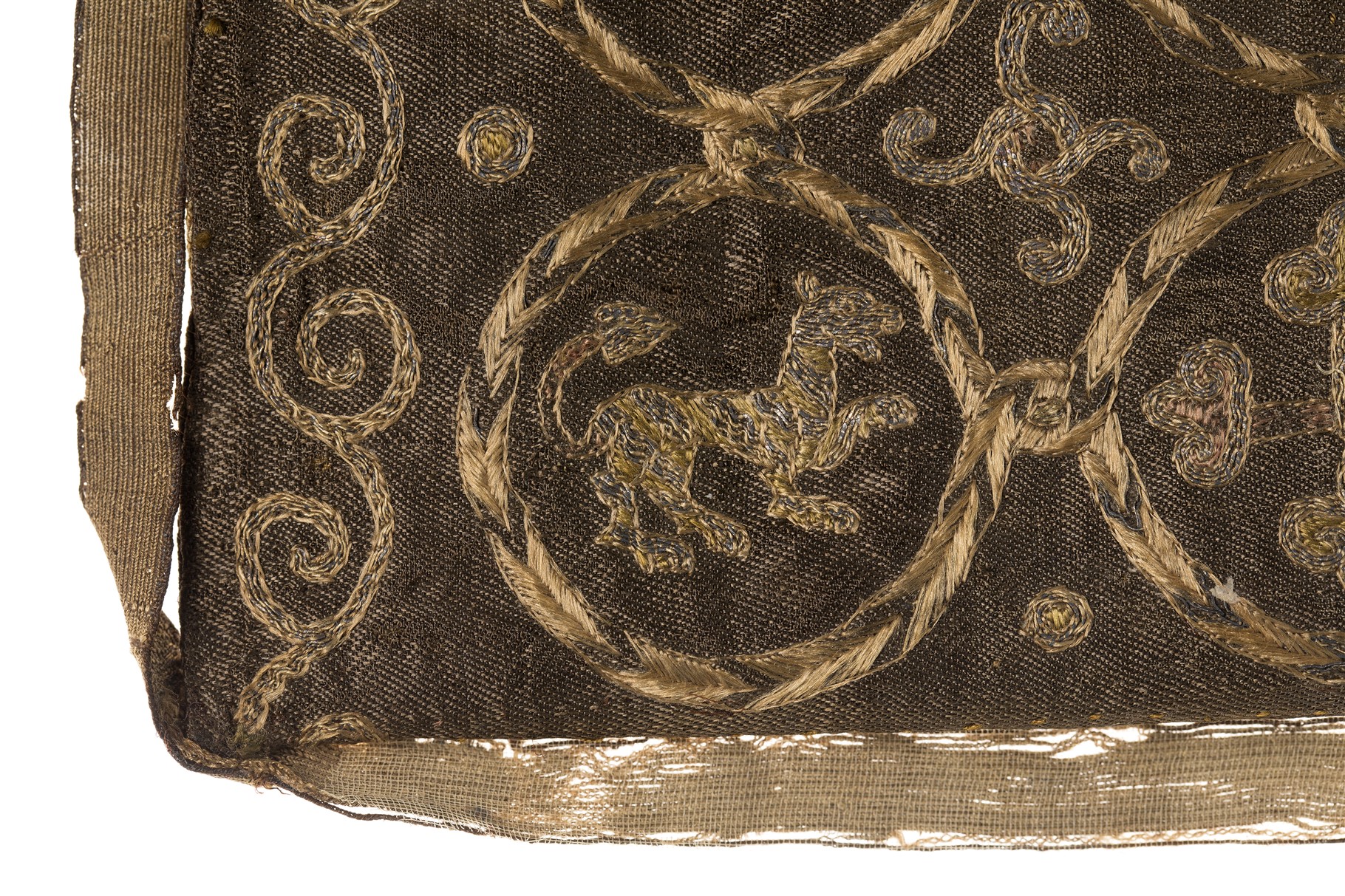 Bruine reliekbeurs geborduurd met ranken en cirkels met o.a. leeuwen, bloemen en vogels