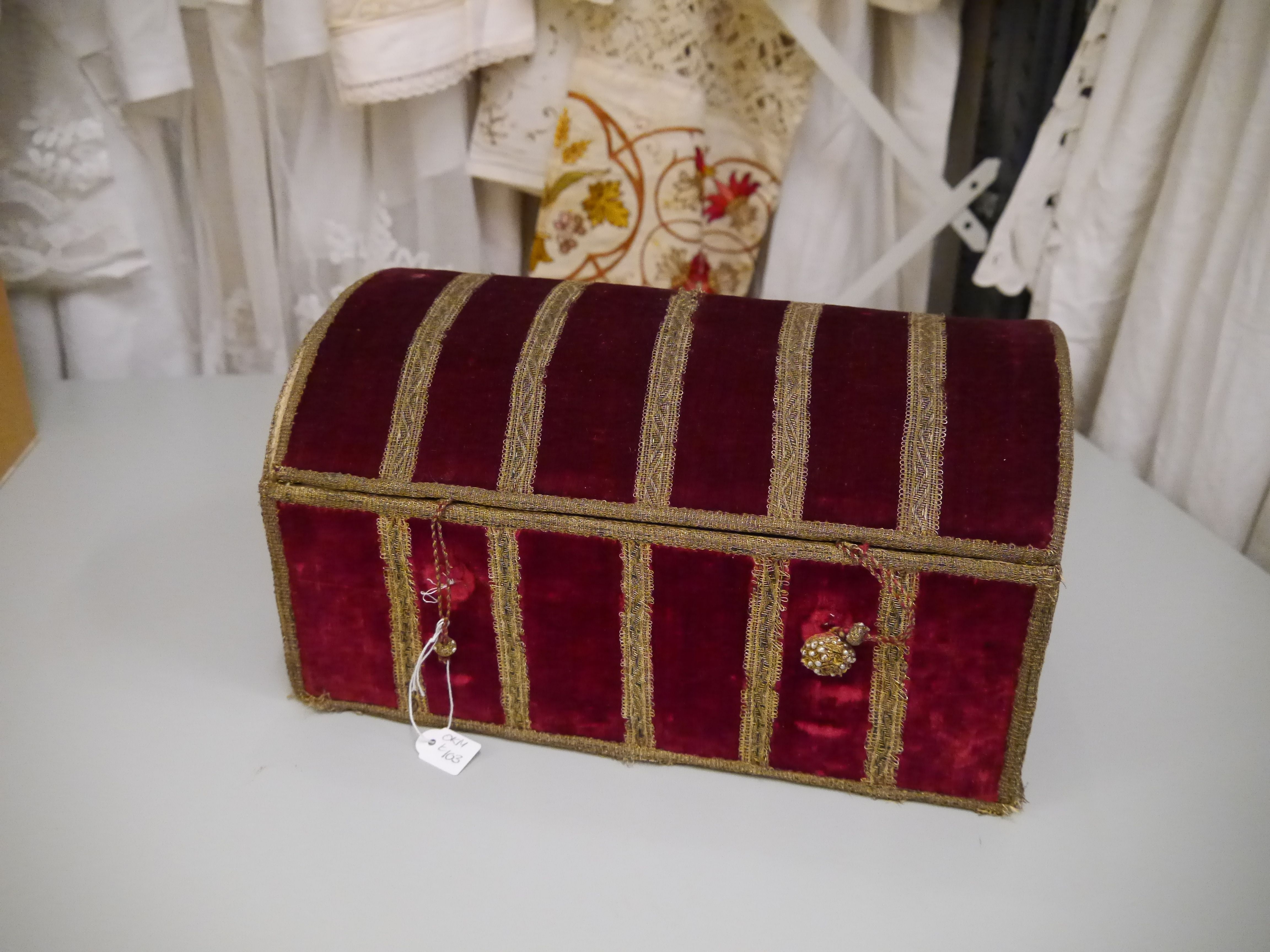 Rood beaardings- of reliekkistje met bol deksel met banden van goudgalon