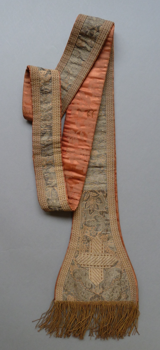 Stola van zilverbrokaat versierd met zalmroze bloemmotieven en rand van goudgalon