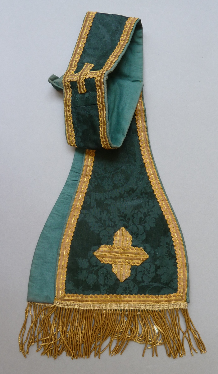 Groene manipel met goudfranje en gestyleerd bloem- en bladpatroon