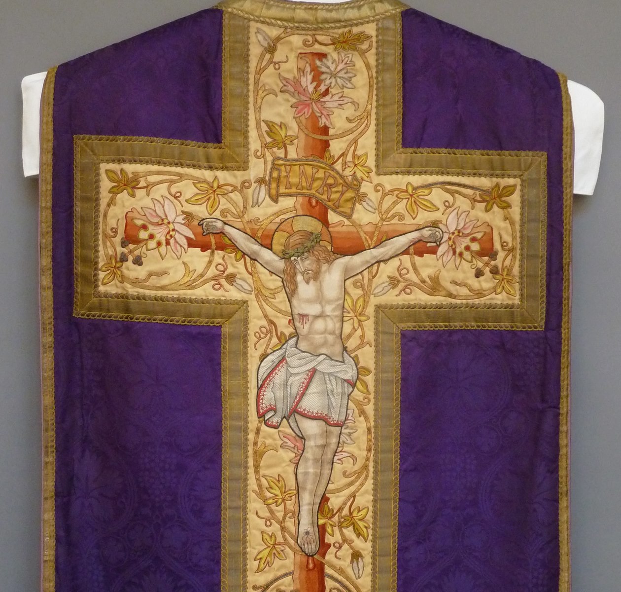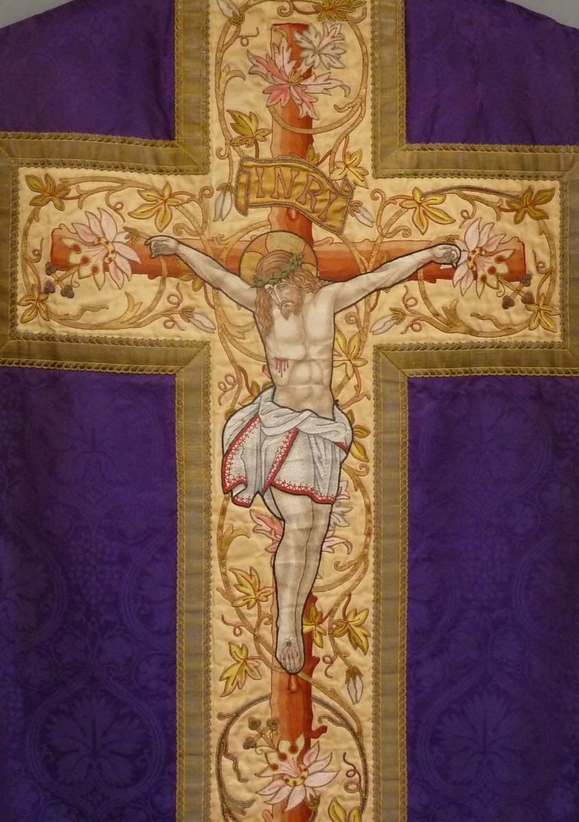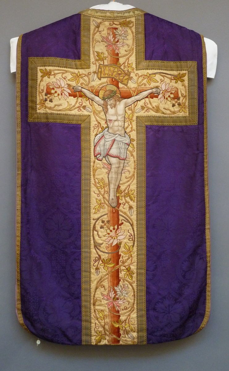 Paars kazuifel met ingeweven wijnranken, crèmekleurige kolom en kruis met kruisiging