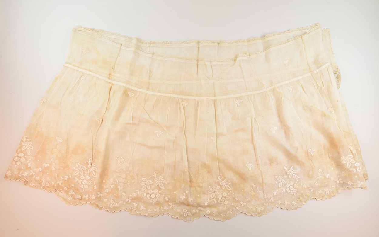 Communiebankdwaal met machinaal wit borduurwerk van druivenbladeren en bloemen