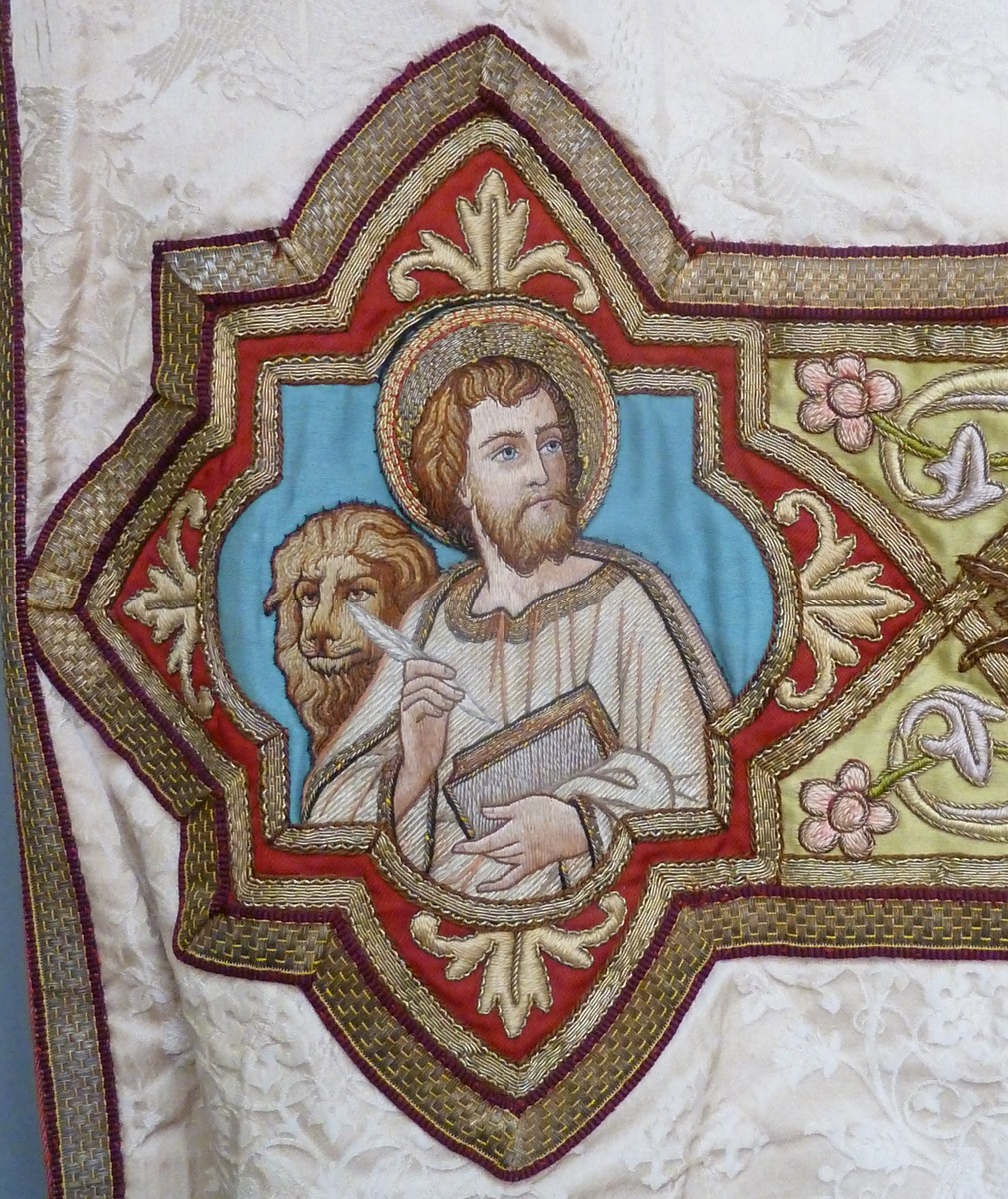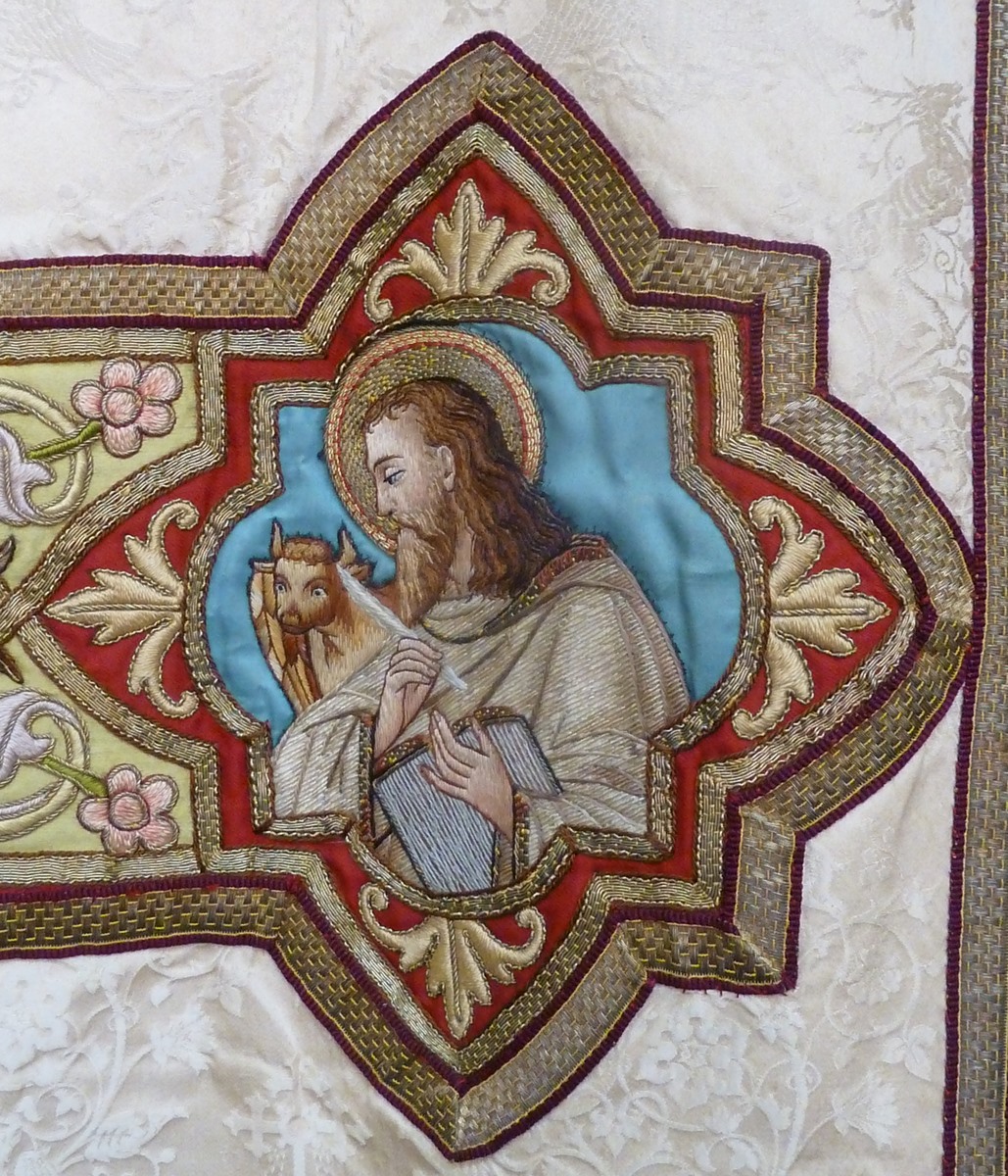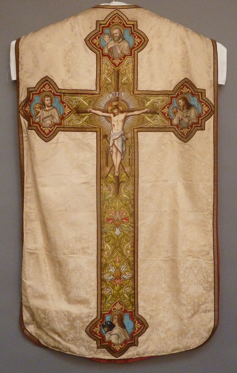 Wit kazuifel, ingeweven herten en vogels, groene kolom en kruis met kruisiging en vier evangelisten