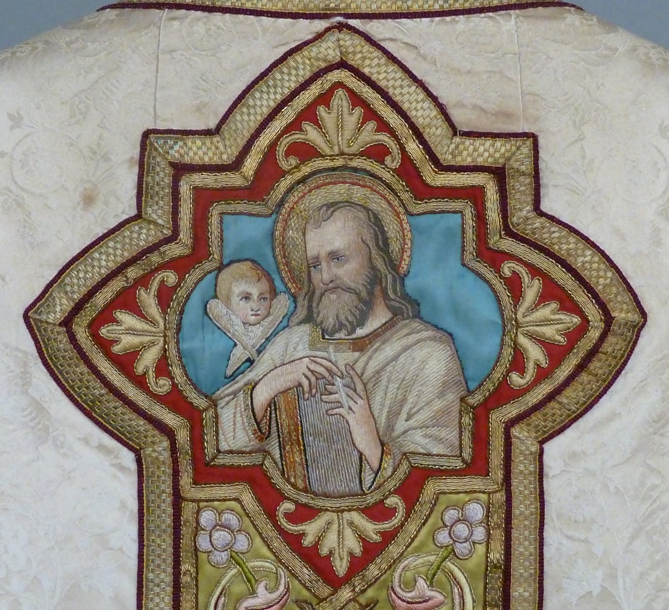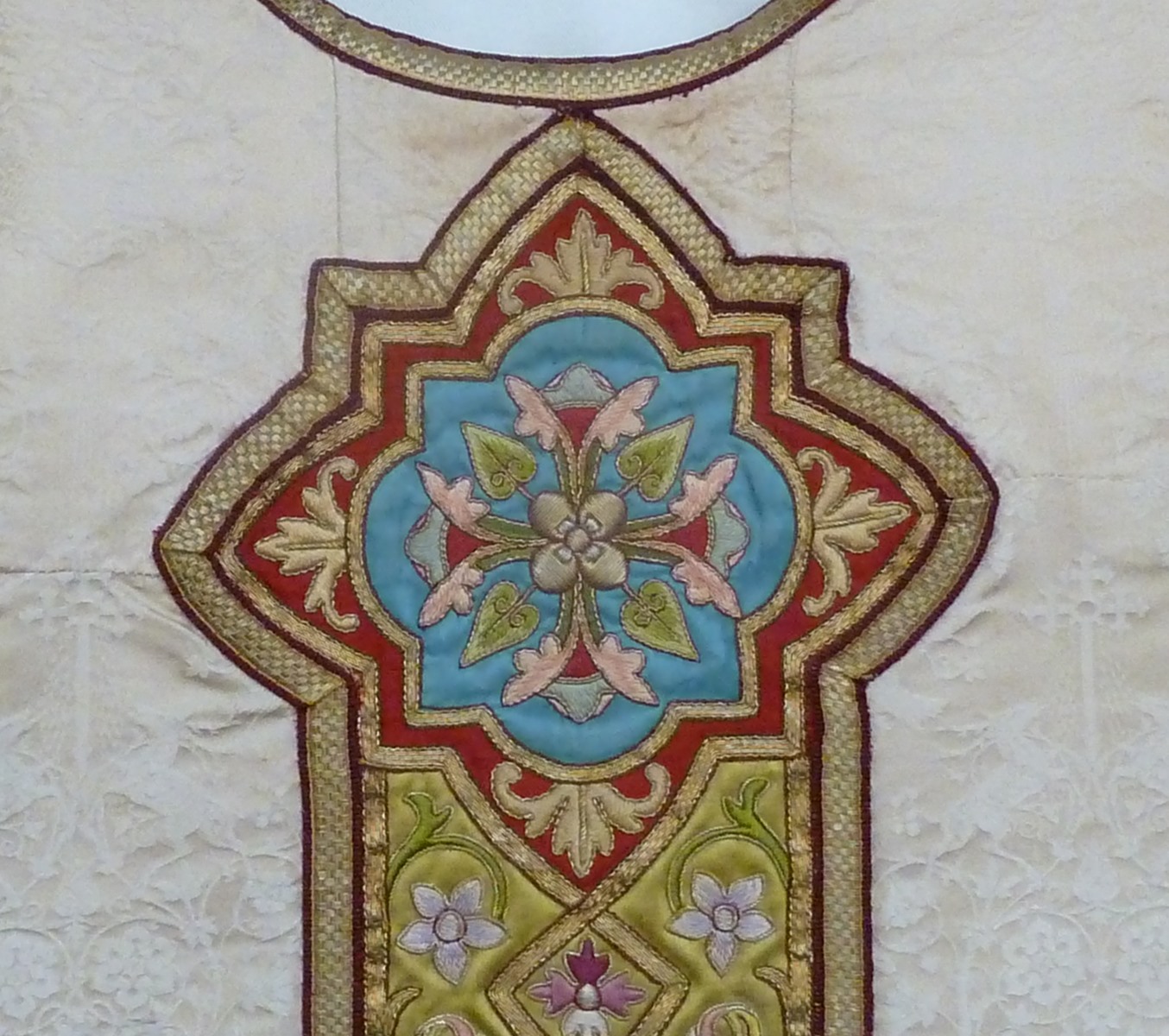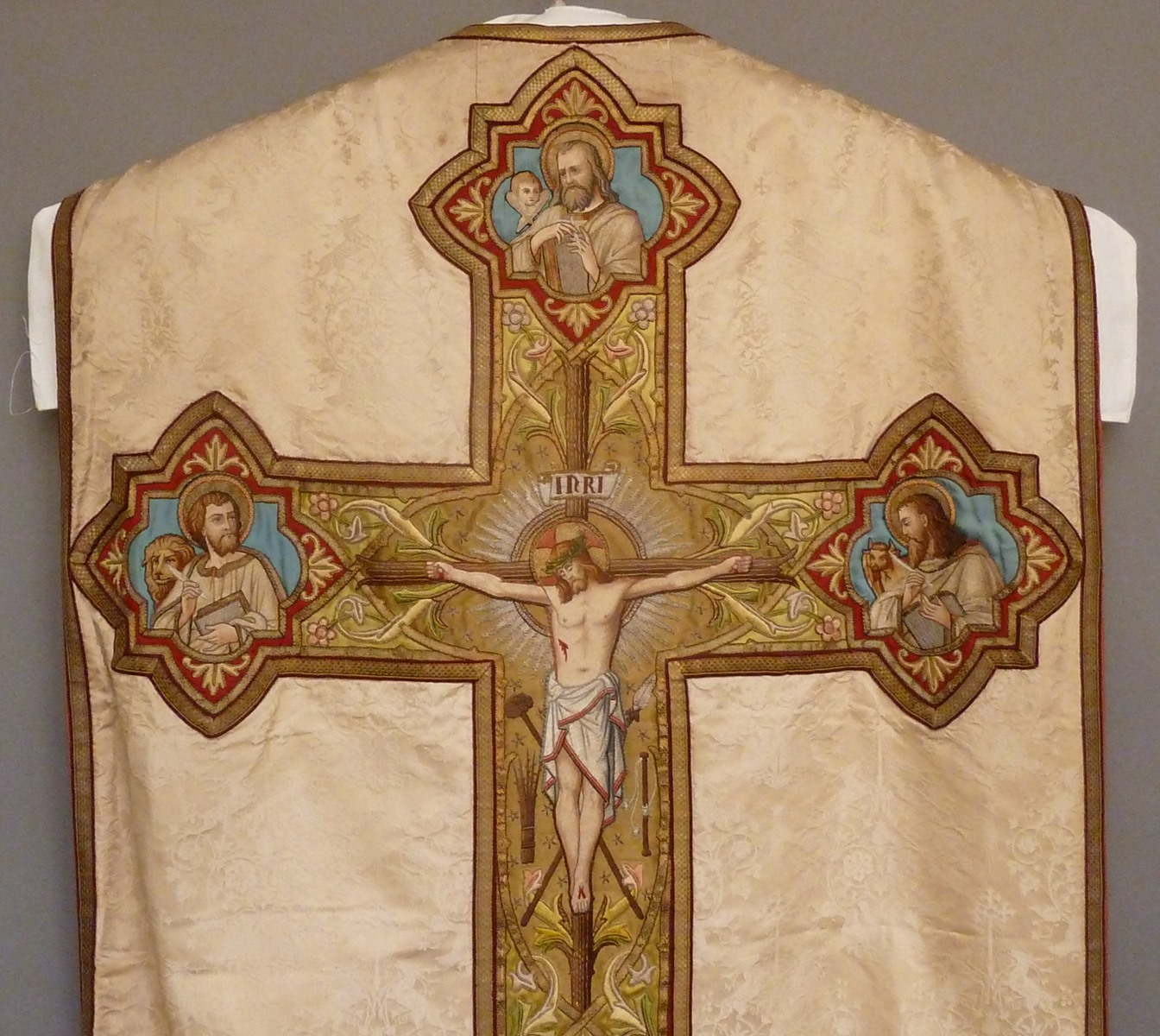 Wit kazuifel, ingeweven herten en vogels, groene kolom en kruis met kruisiging en vier evangelisten