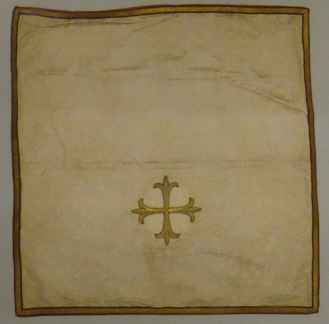 Wit kelkvelum met ingeweven herten en vogels, kruisje van gelegd gouddraad, rand van goudgalon