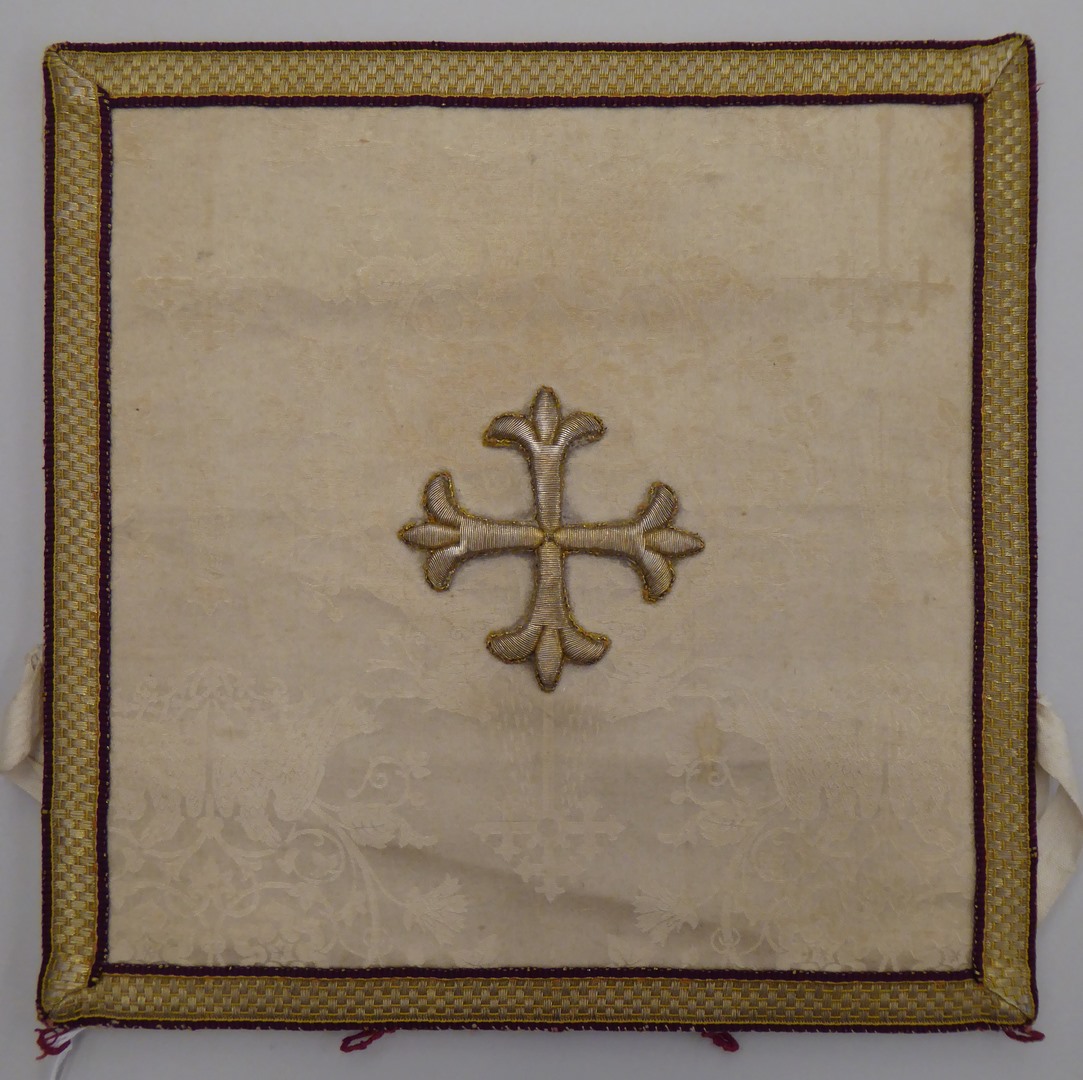 Witte beurs met ingeweven herten en vogels, kruisje van gelegd gouddraad, rand van goudgalon