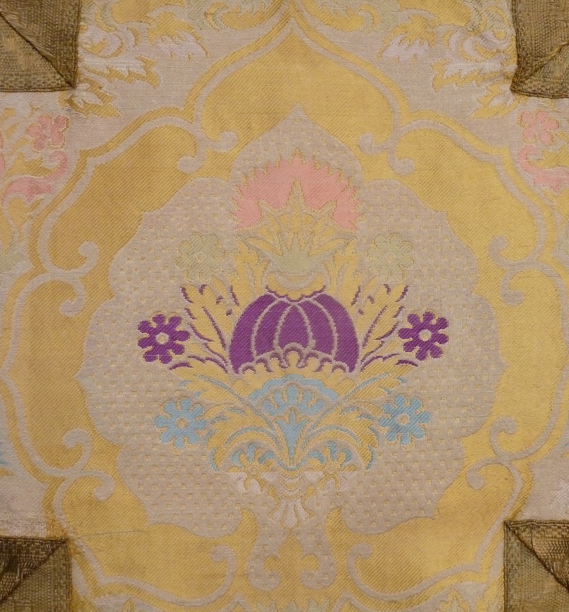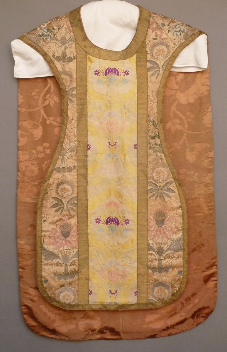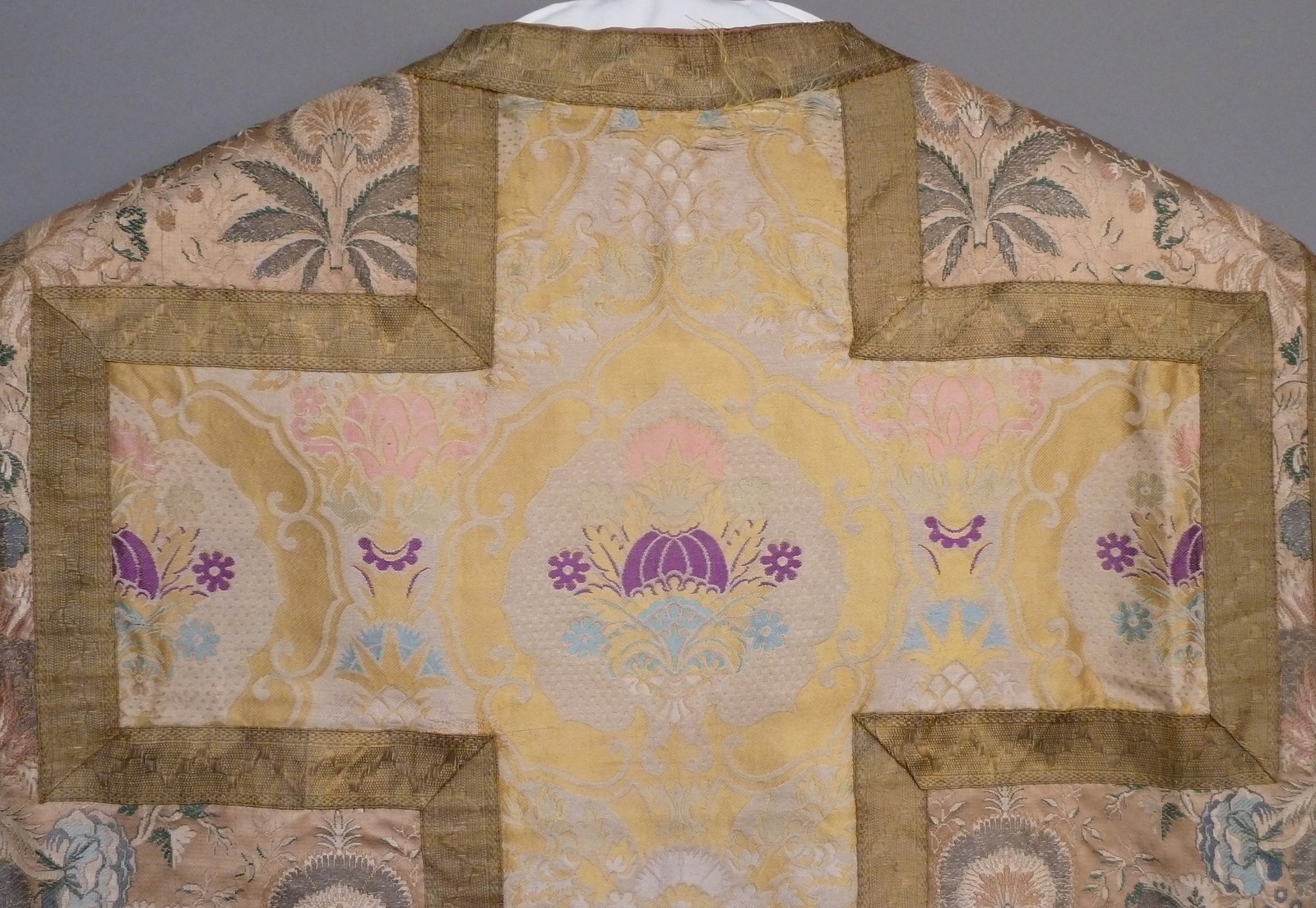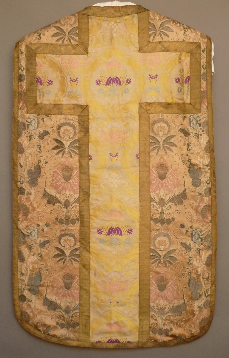 Beige kazuifel met ingeweven veelkleurig bloem- en granaatappelmotief, gele kolom en kruis
