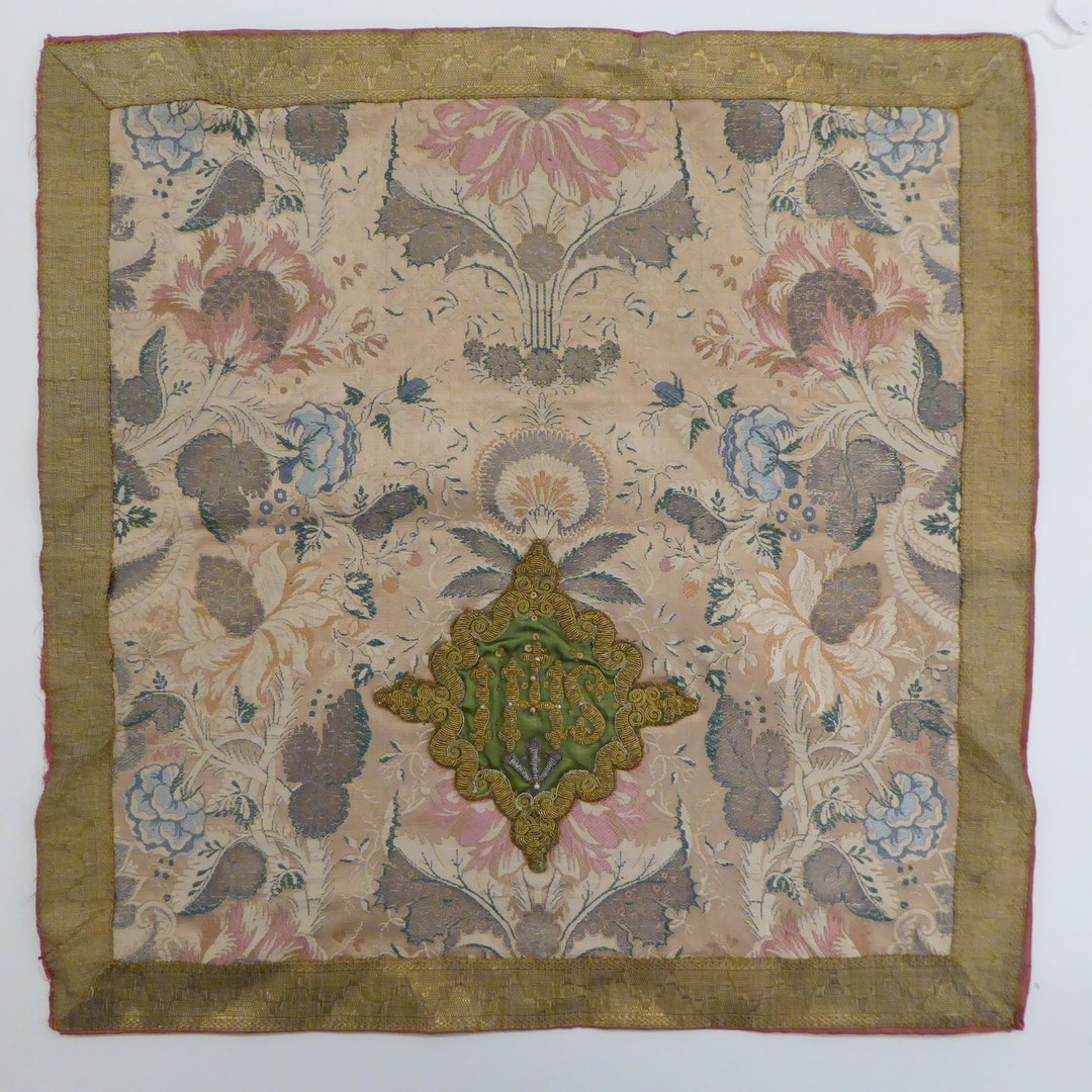 Beige kelkvelum met ingeweven veelkleurig bloem- en granaatappelmotief, kruisje, rand van goudgalon