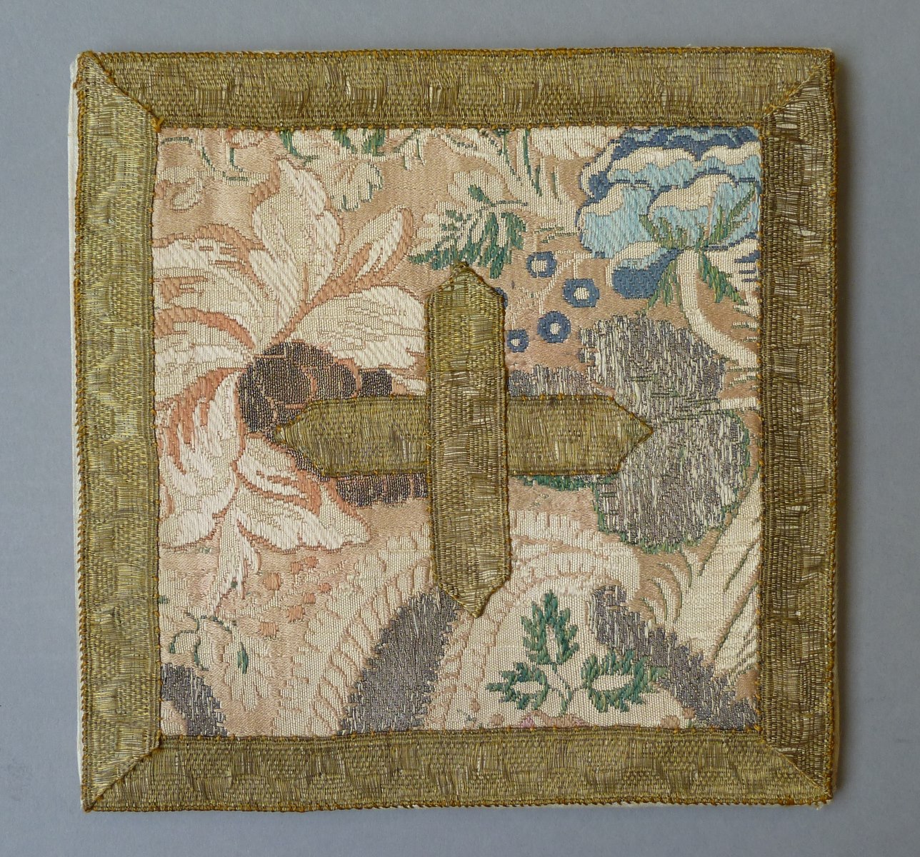 Beige palla met ingeweven veelkleurig bloem- en granaatappelmotief, kruisje, rand van goudgalon