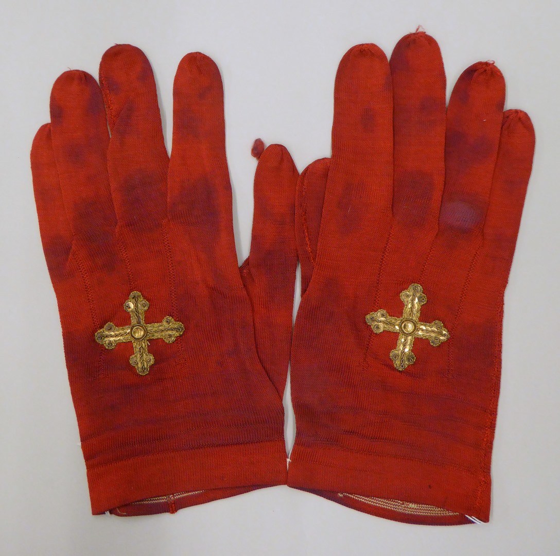 Rode rechterbisschopshandschoen met aan bovenzijde kruisje van pailletjes en gouddraad