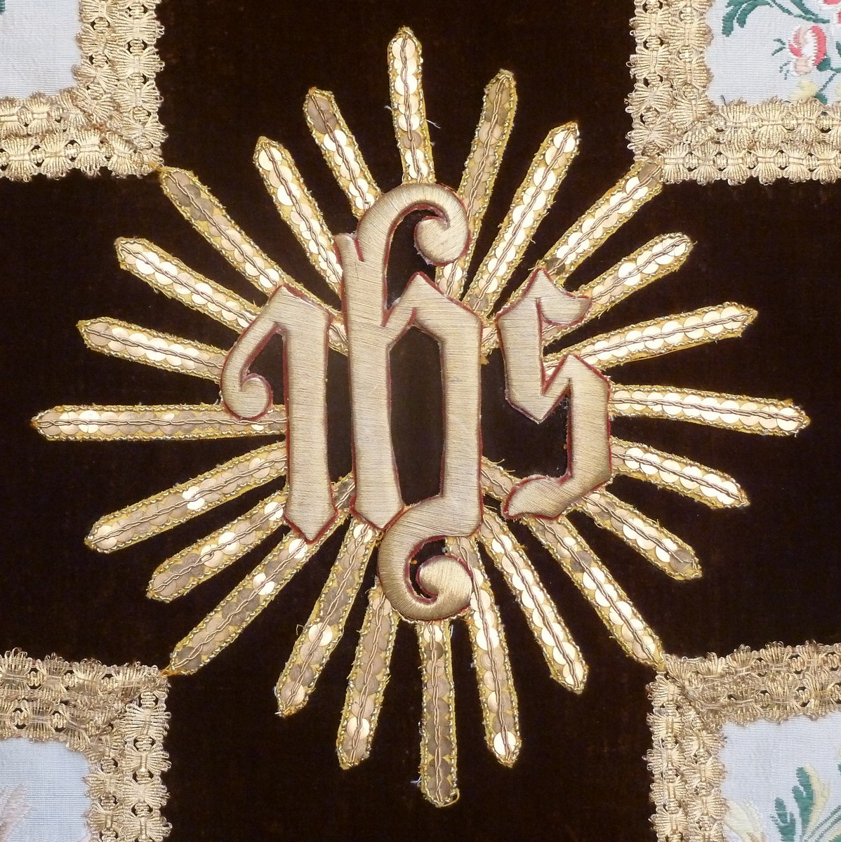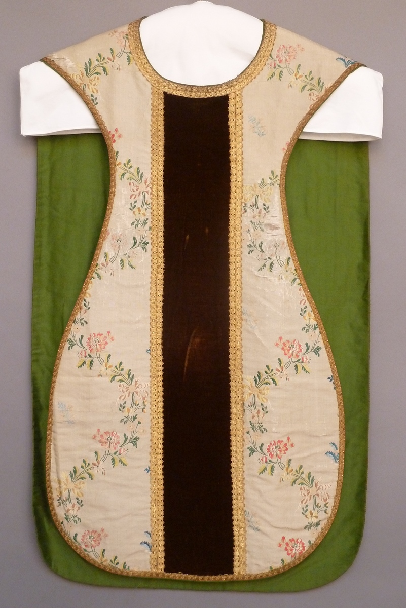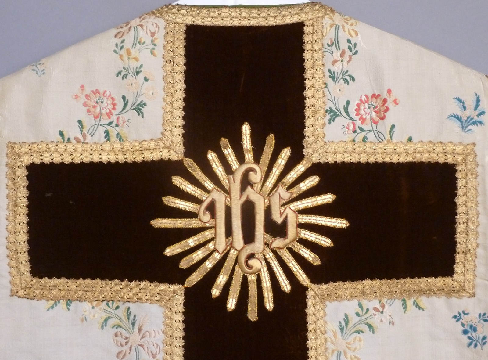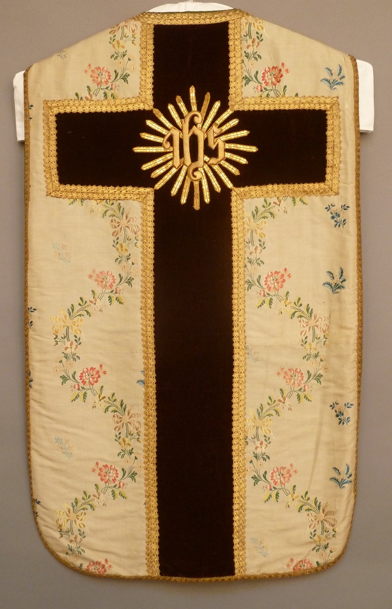 Wit kazuifel met ingeweven bloemslingers van gele en rode bloemen, kolom en bruin kruis met IHS