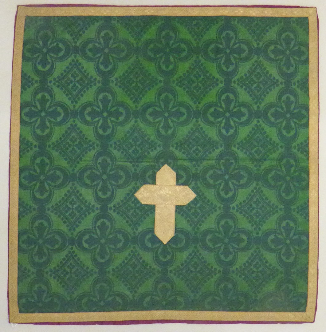 Groene kelkvelum met ingeweven vierpasmotieven, rand en kruisje van zilvergalon
