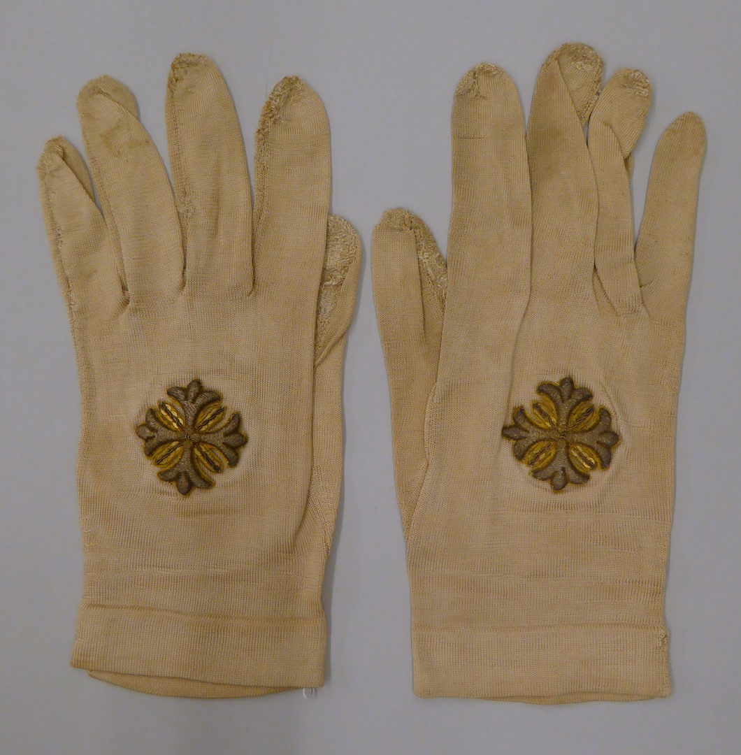 Witte (crème) linkerbisschopshandschoen met aan bovenzijde kruisje van pailletjes en gouddraad