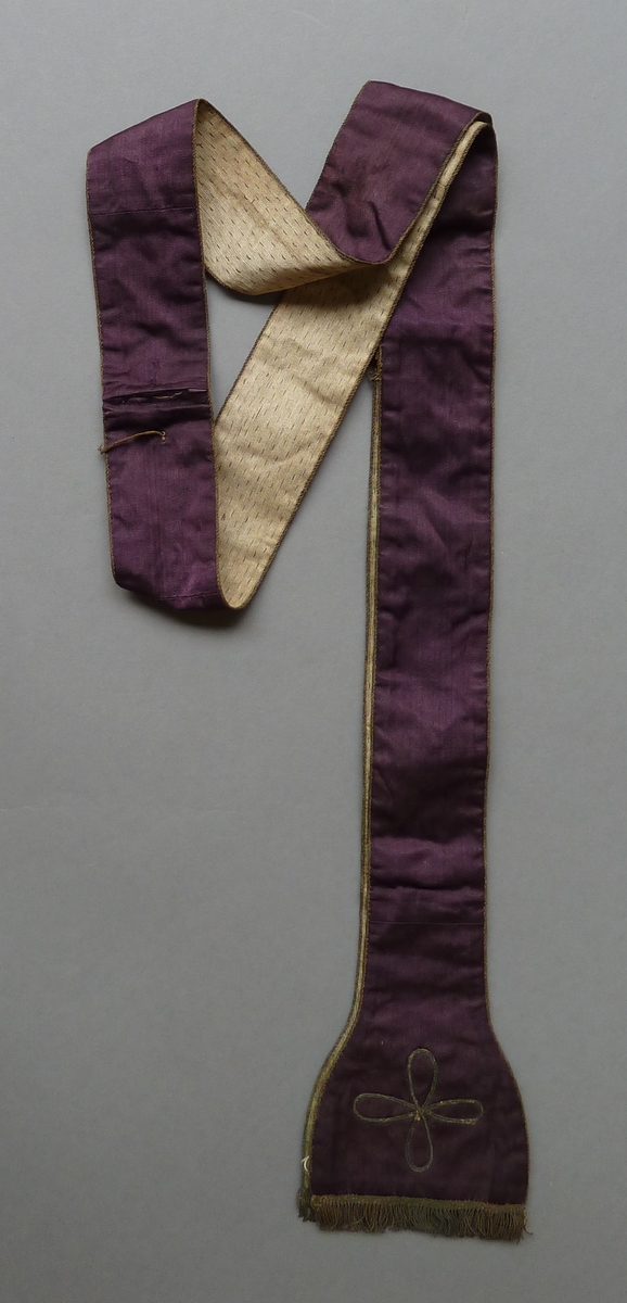 Paars-witte ziekenstola met kruisjes van gelegd gouddraad, afgezet met goudfranje