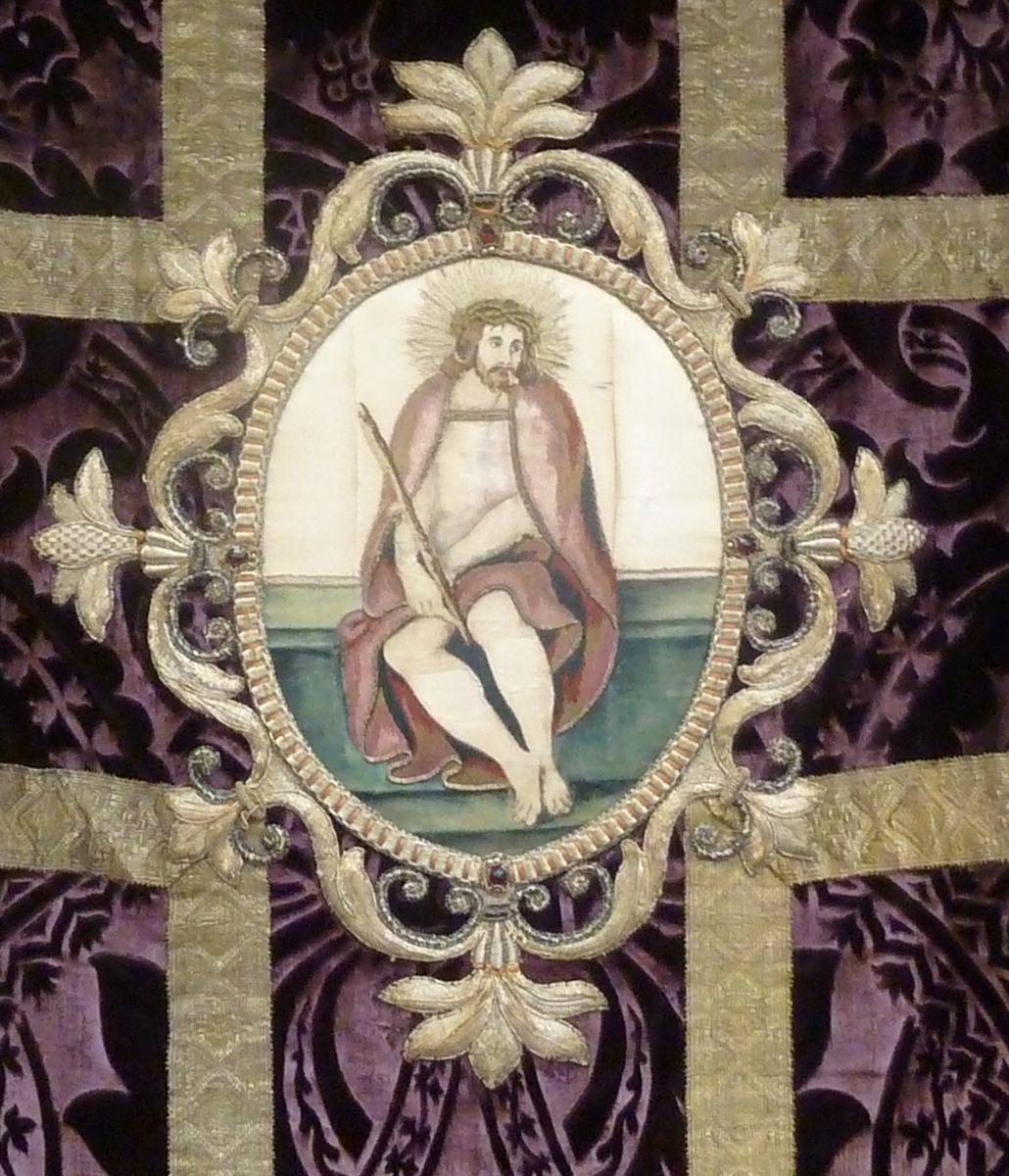 Paars kazuifel met ingeweven Lodewijk XIV motieven, medaillon met Christus als Man van Smarten