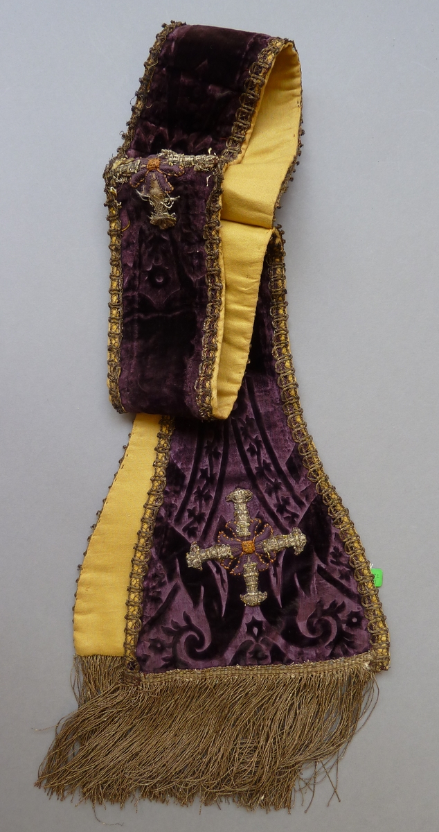 Paarse manipel met ingeweven Lodewijk XIV motieven afgezet met goudgalon en goudfranje