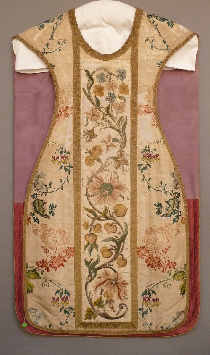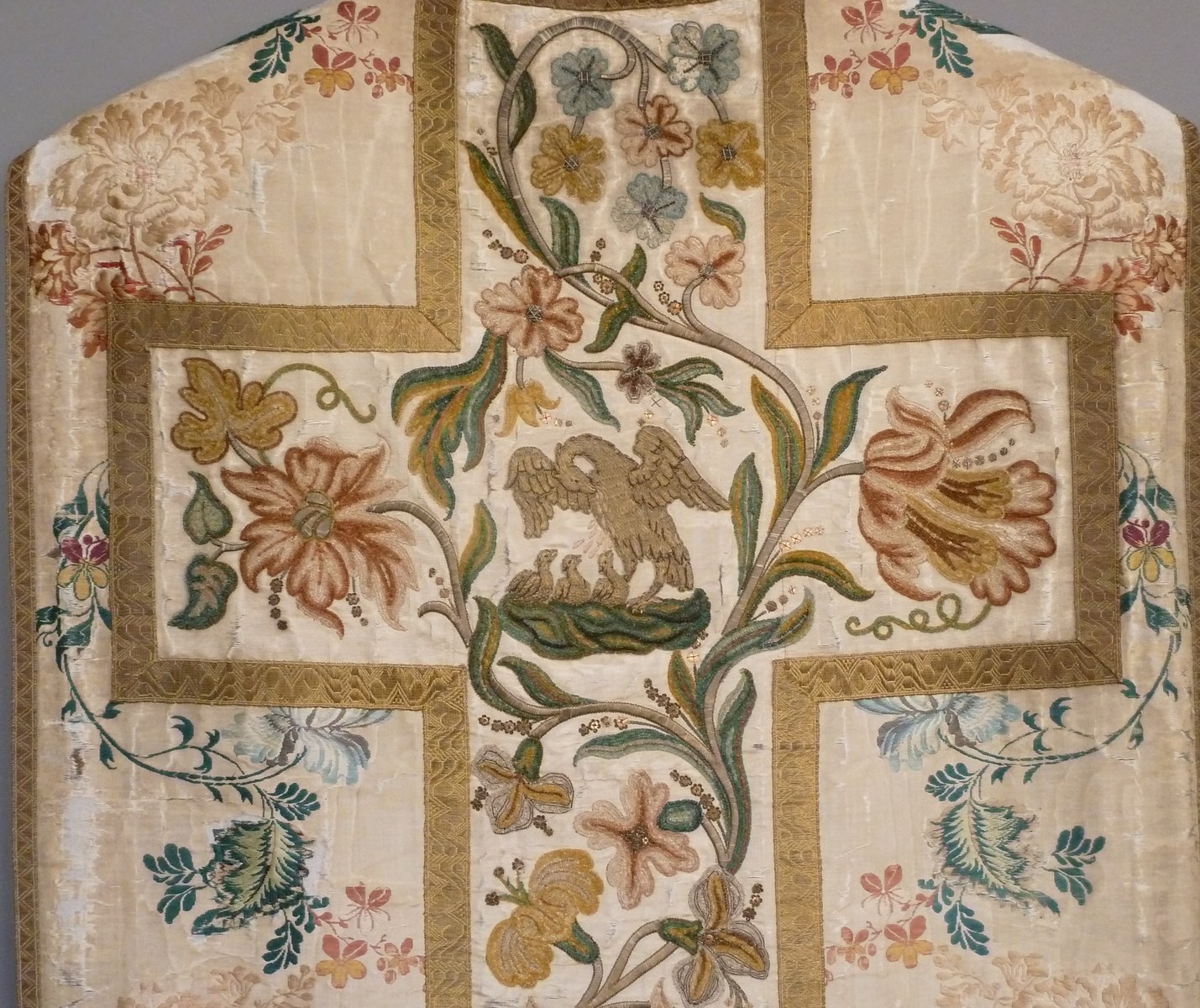 Wit kazuifel met ingeweven veelkleurig bloemmotief, met pelikaan