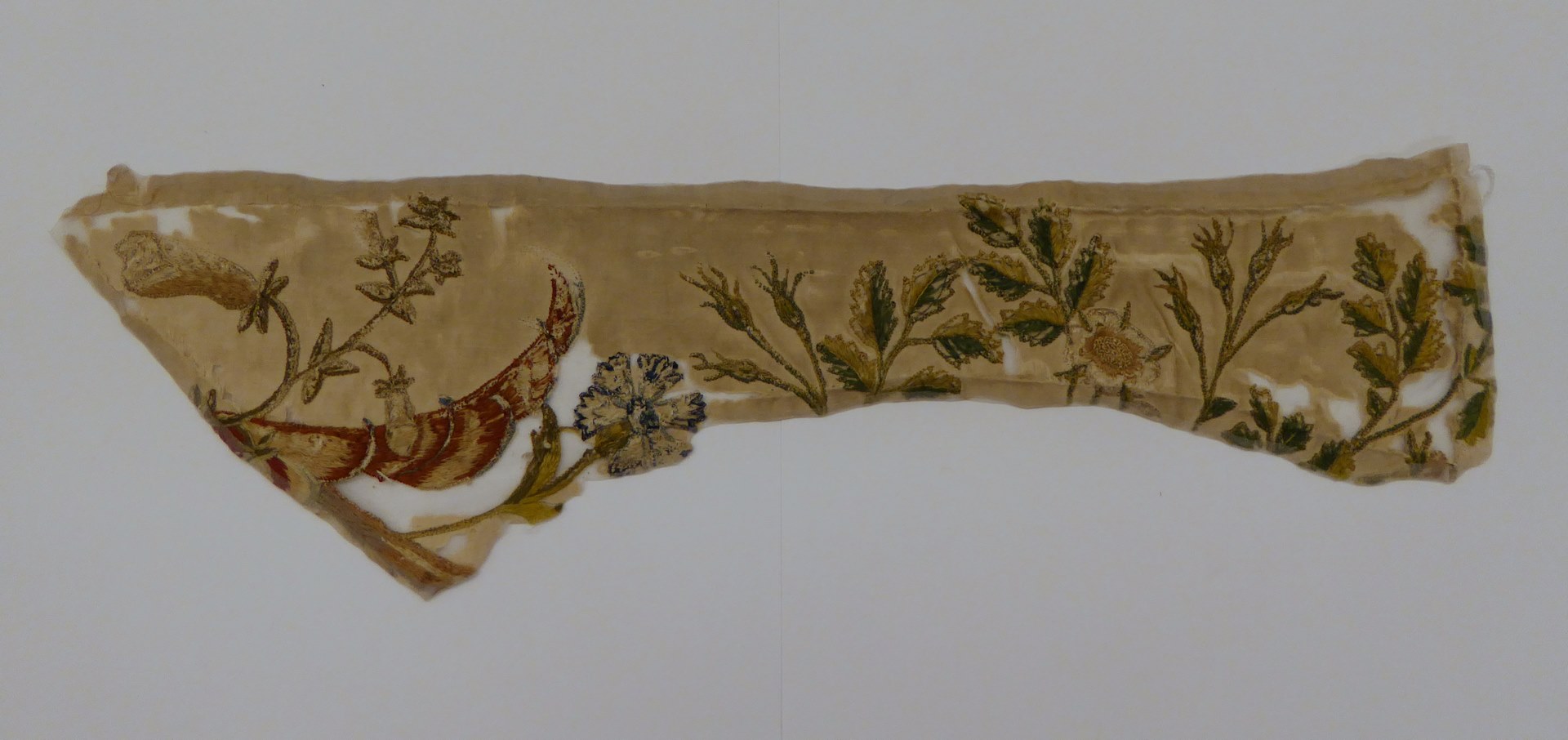 Fragment (rechtsvoor) van OKM t135a van vóór restauratie 1986: ivoorkleurig weefsel met veelkleurige bloemen