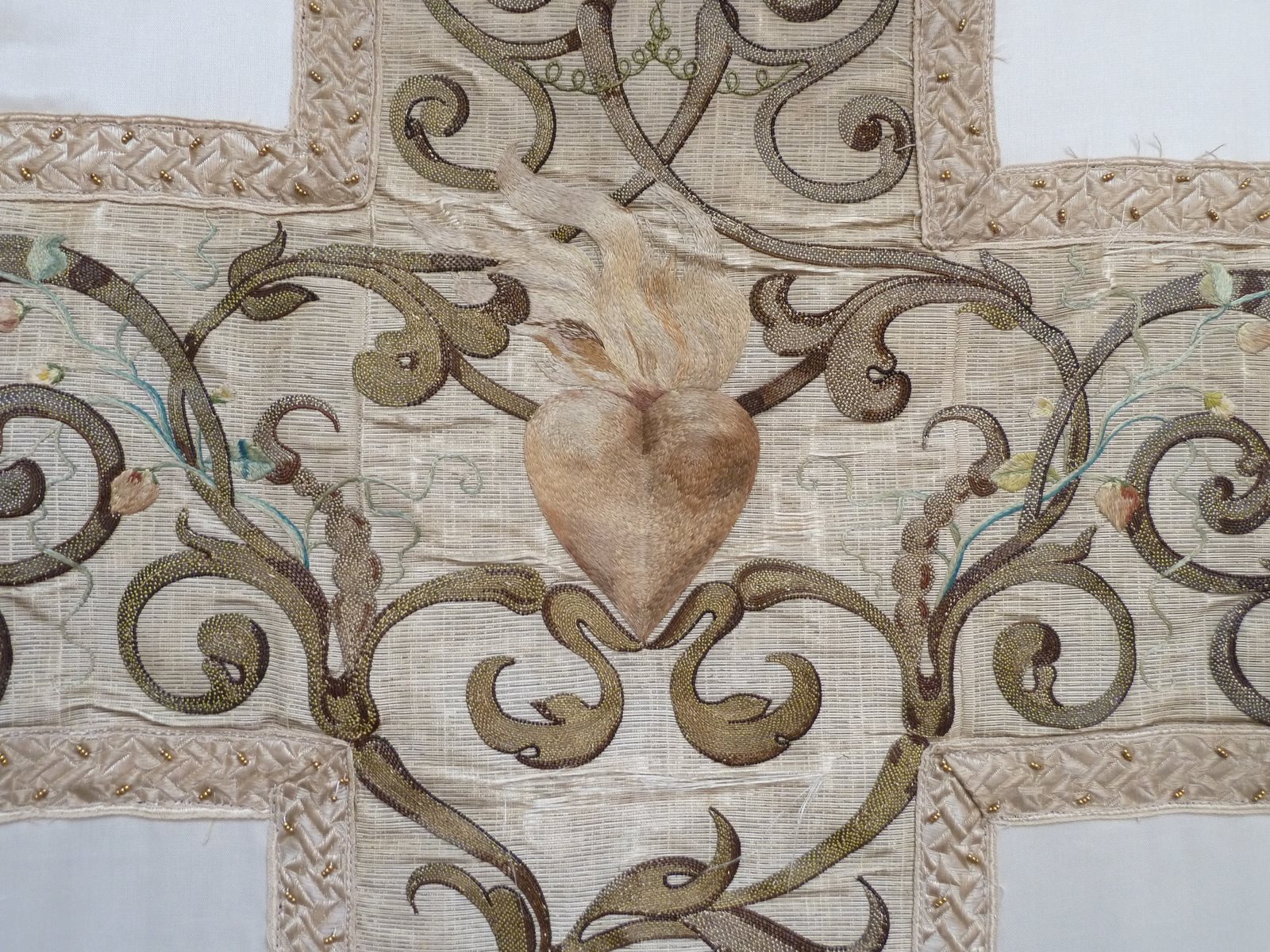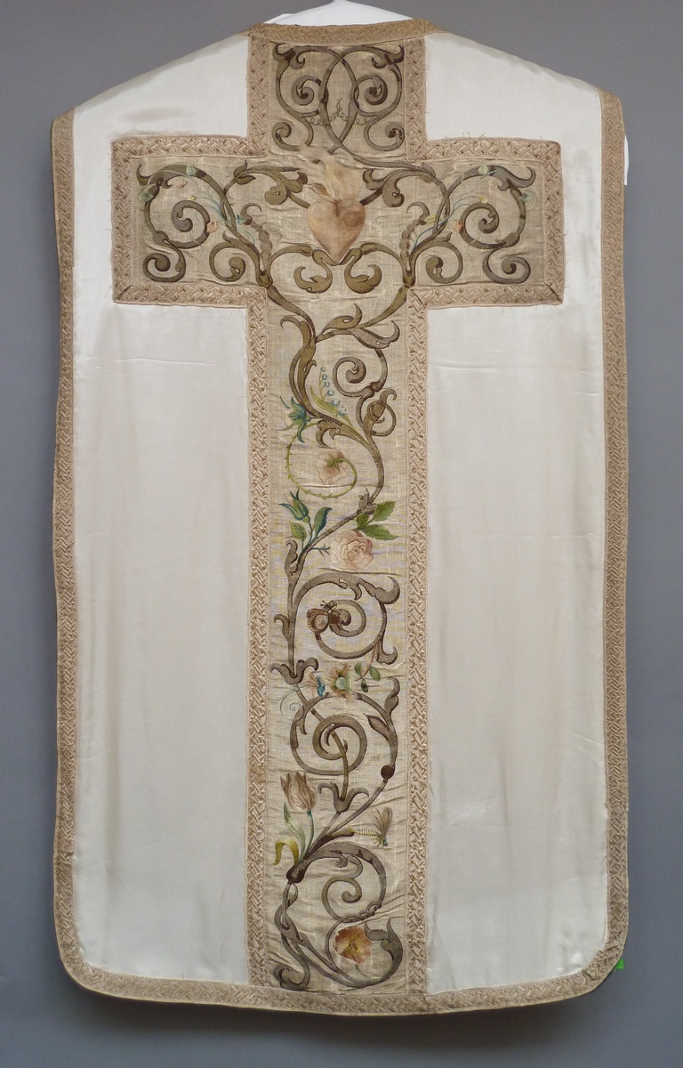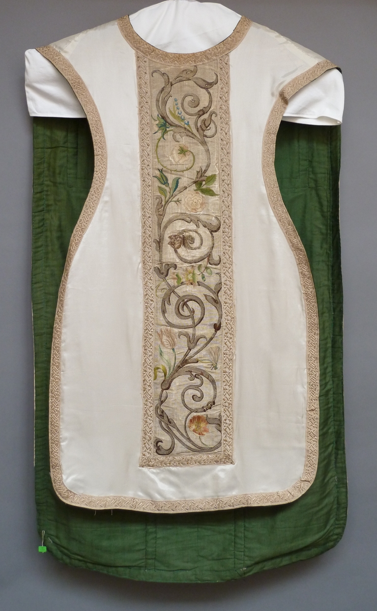 Wit kazuifel met witte kolom en kruis gelameerd met goud en zilverdraad