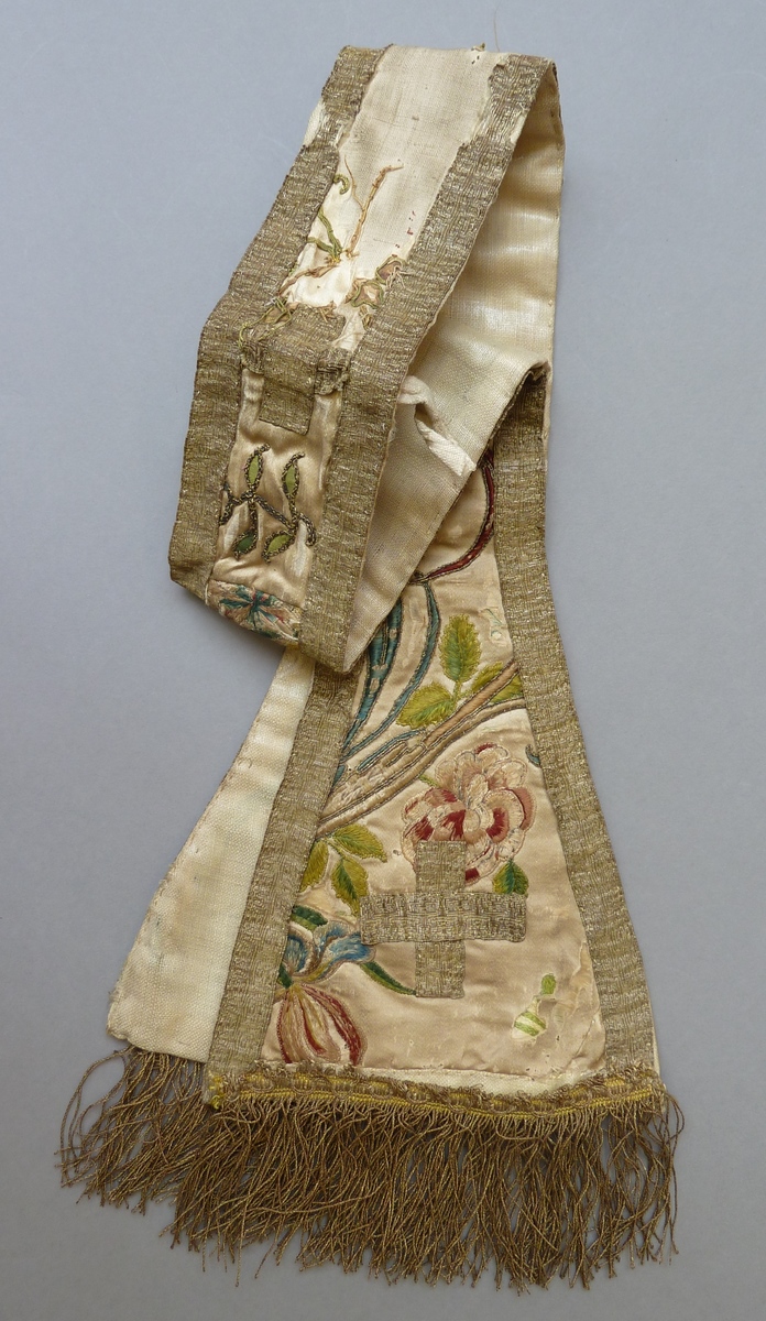 Witte manipel geborduurd met veelkleurige bloem- en en bladeren, afgezet met goudgalon en franje