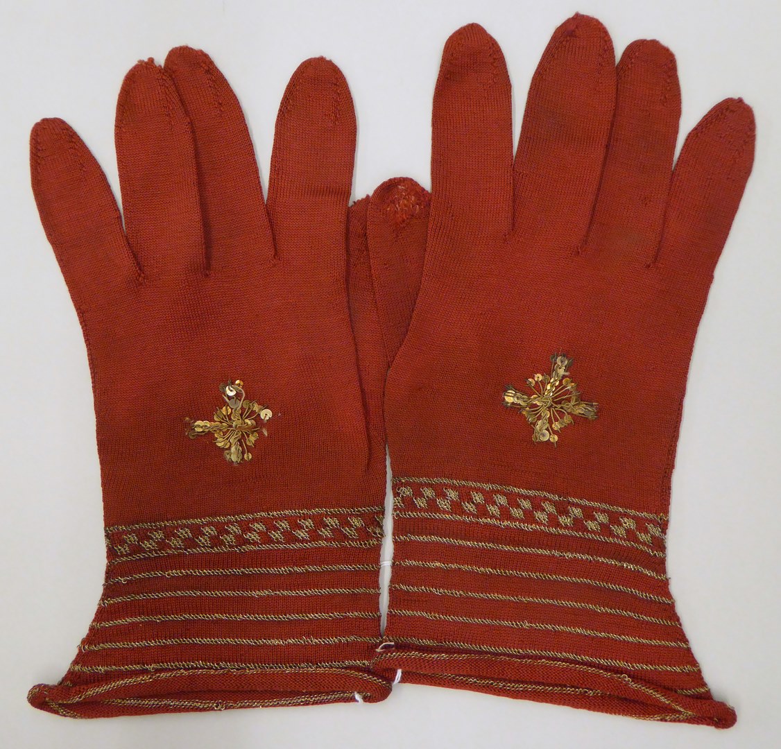 Rode linkerbisschopshandschoen met aan bovenzijde kruisje van gouddraad en pailletten