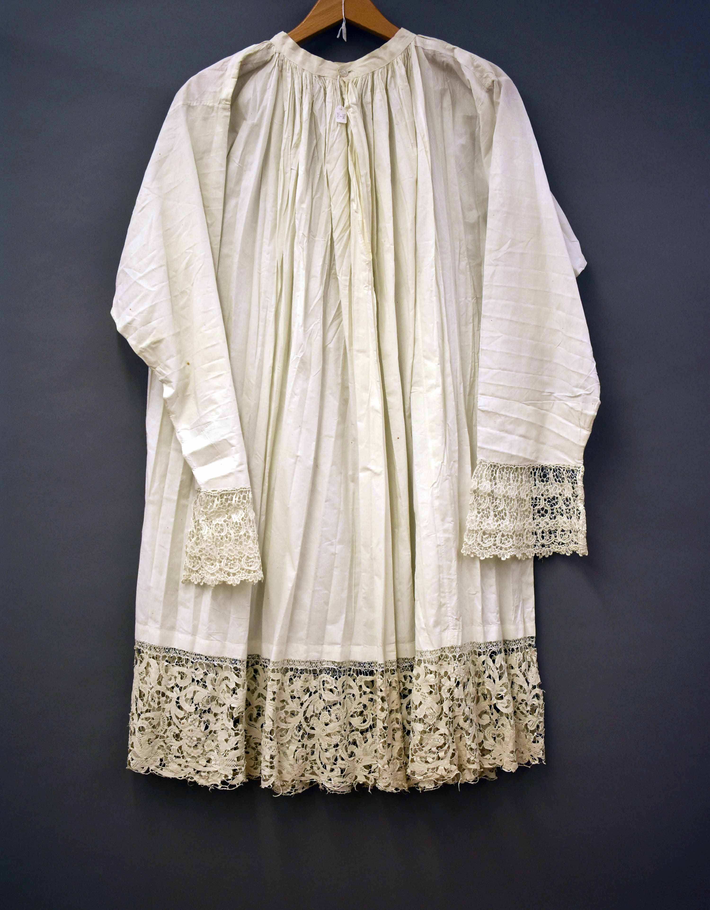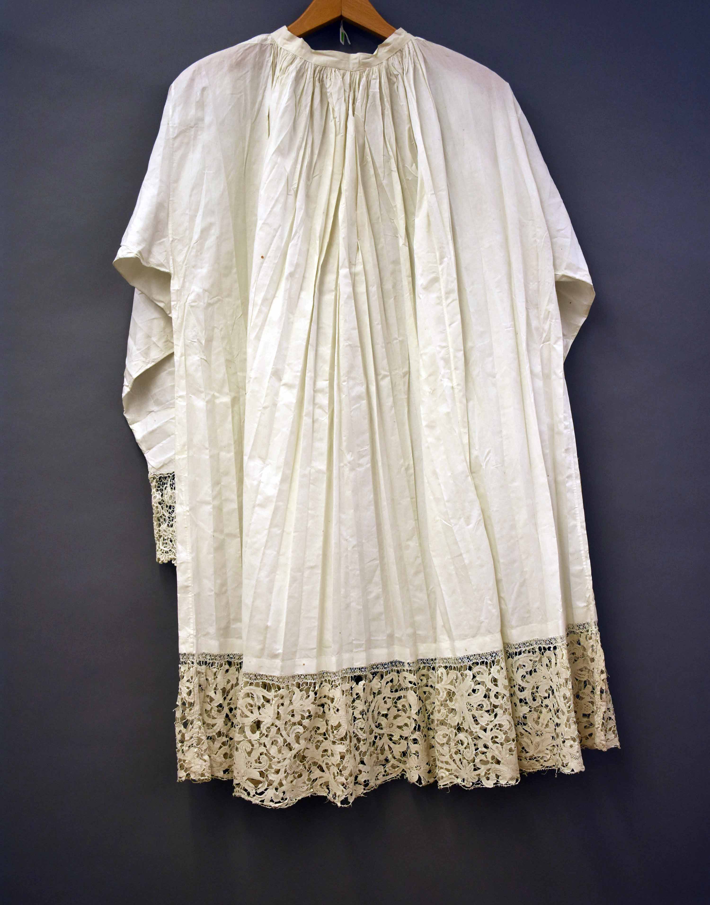 Superplie afgezet met lintkant, langs de mouwen machinaal kant met bloemen