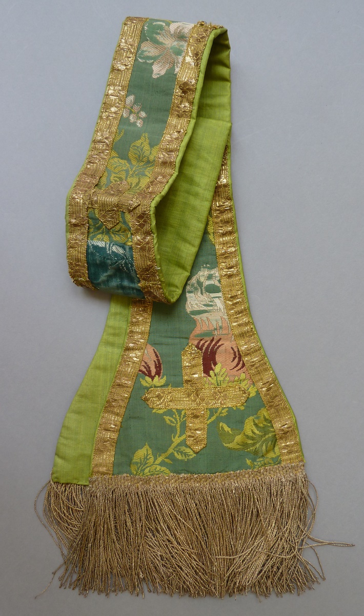 Groene manipel met ingeweven bloemmotieven met drie Griekse kruisen van goudgalon