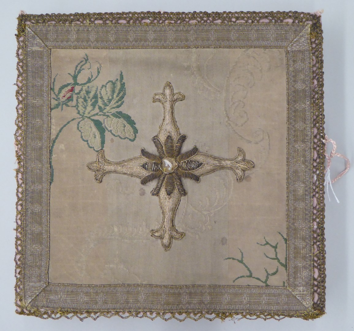 Crème palladoos met geborduurde florale motieven en kruis van gehoogd gouddraad