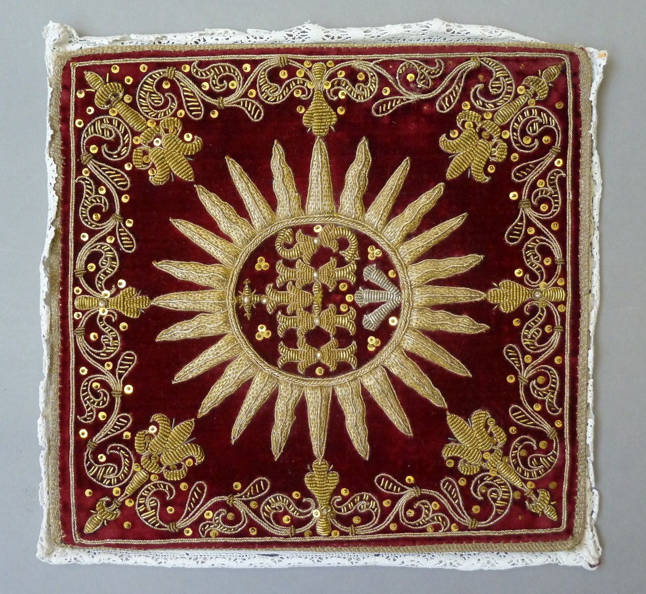 Rode palla met IHS in gouden stralenkrans, met parels en pailletten