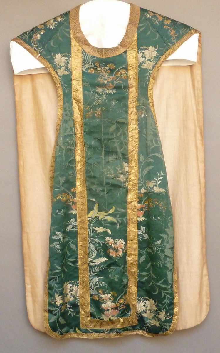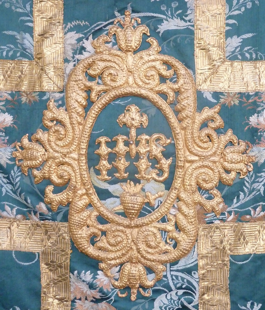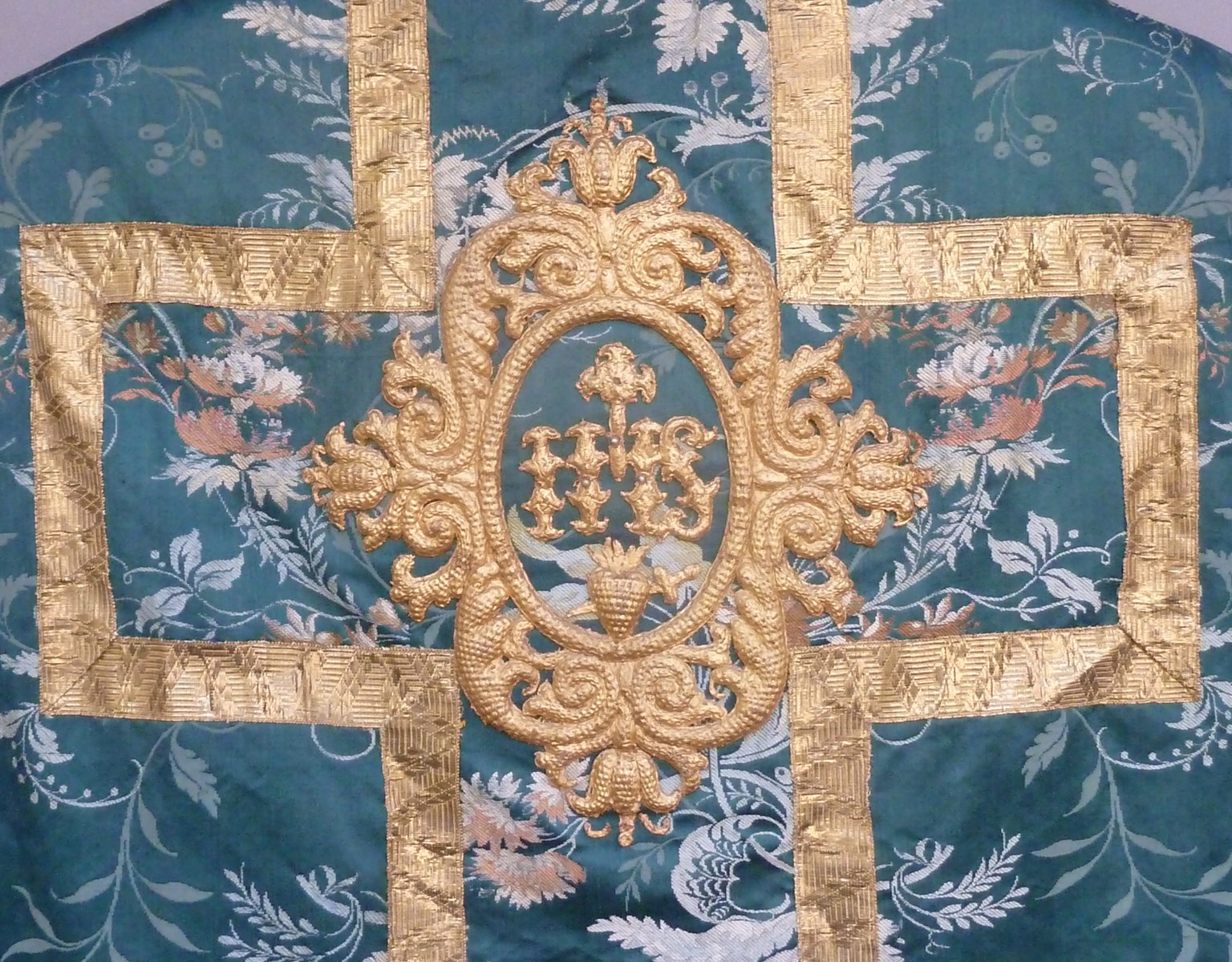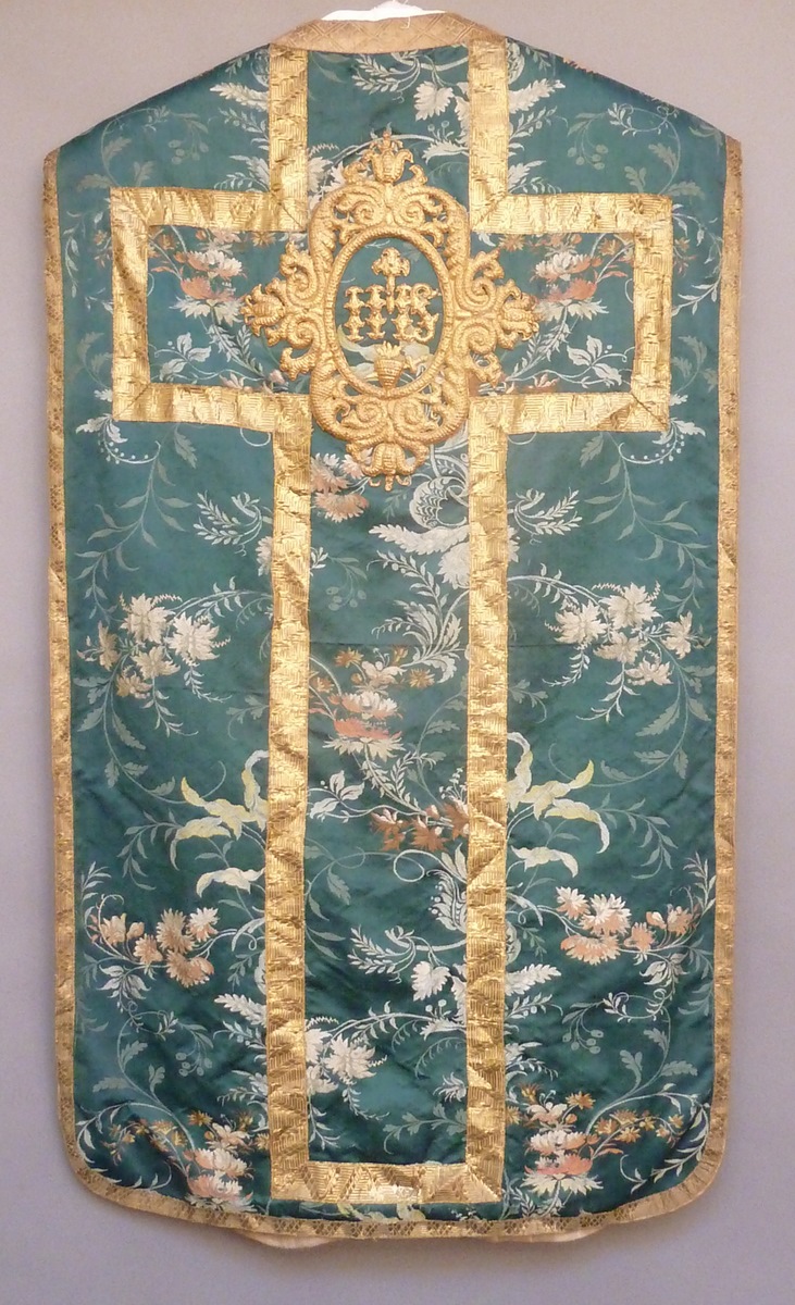 Groen kazuifel met ingeweven bloemmotieven en medaillon met IHS