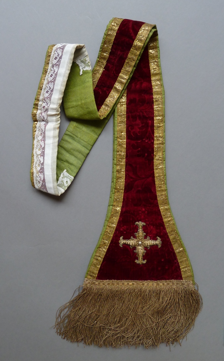 Rode stola met ingeweven bloempatroon en kruisjes van goudborduurwerk met parels