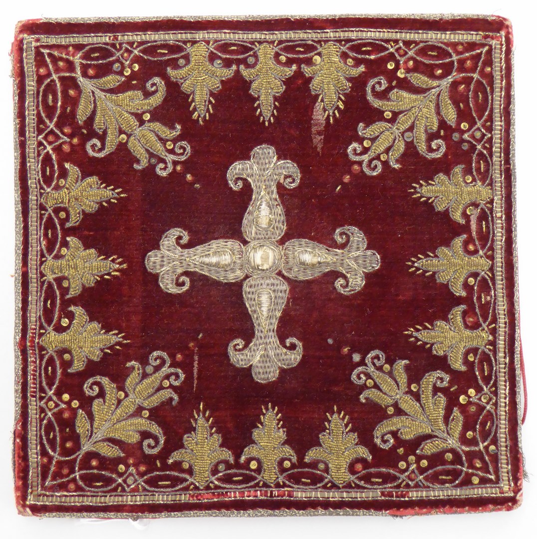 Rode beurs met leliekruis en bloemranken van gehoogd gouddraad