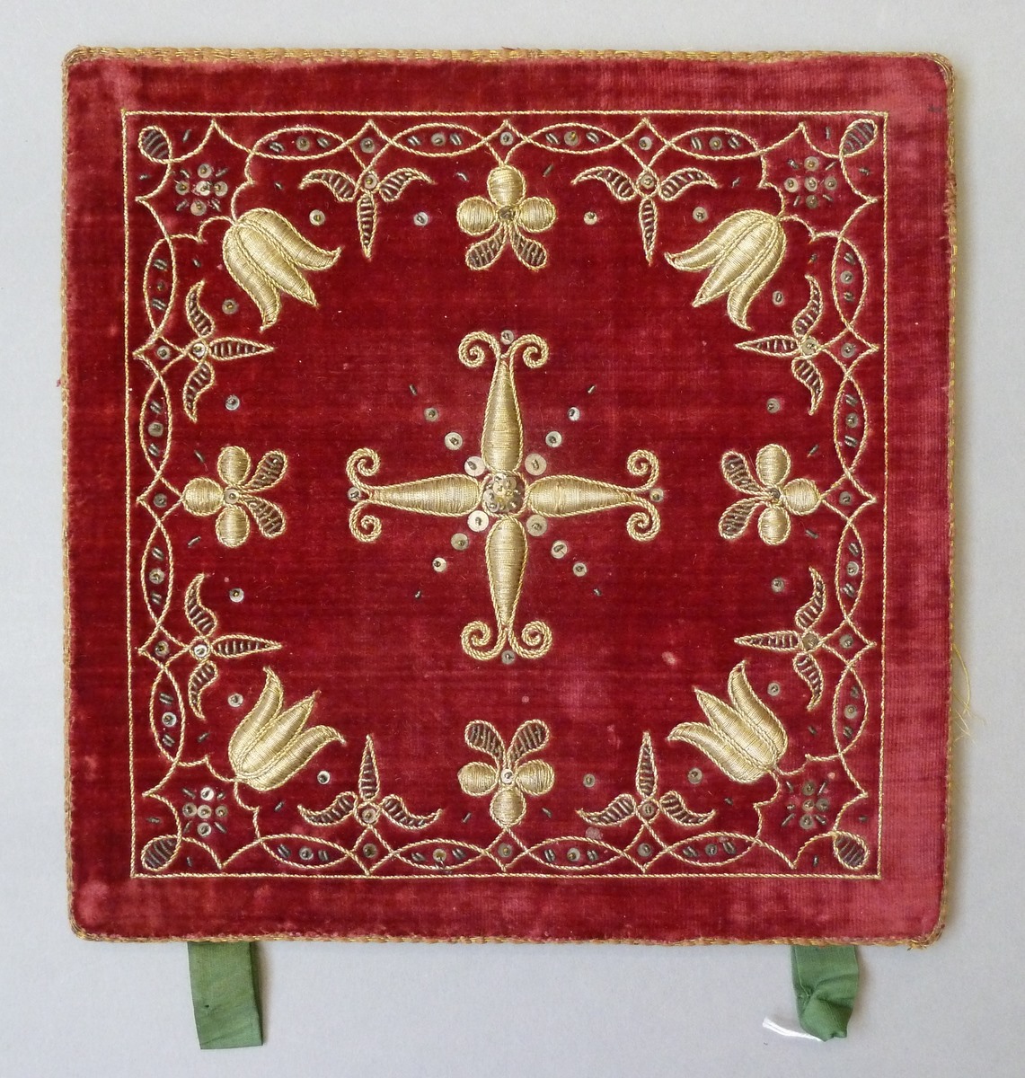 Rode palla met leliekruis omgeven door ranken met lelies, alles in gehoogd gouddraad
