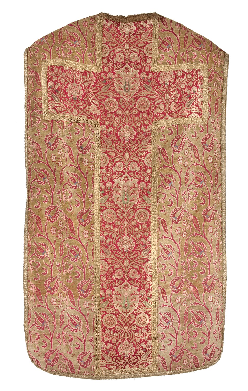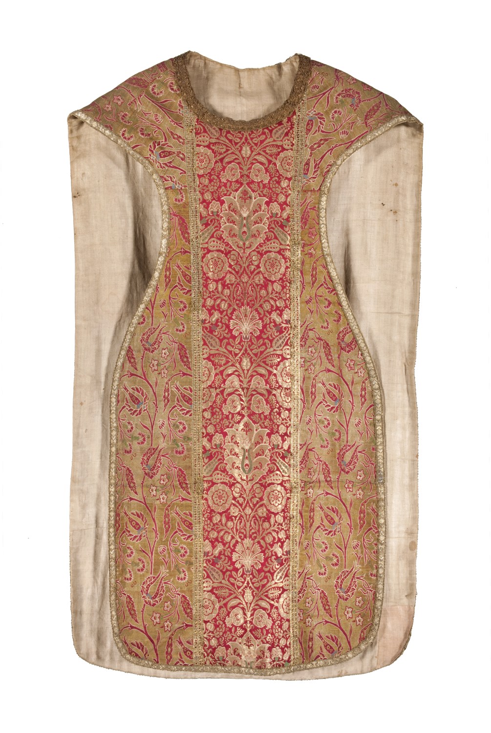 Goudkleurig kazuifel met ingeweven rode bloemen en rode kolom met bloemmotieven van gouddraad