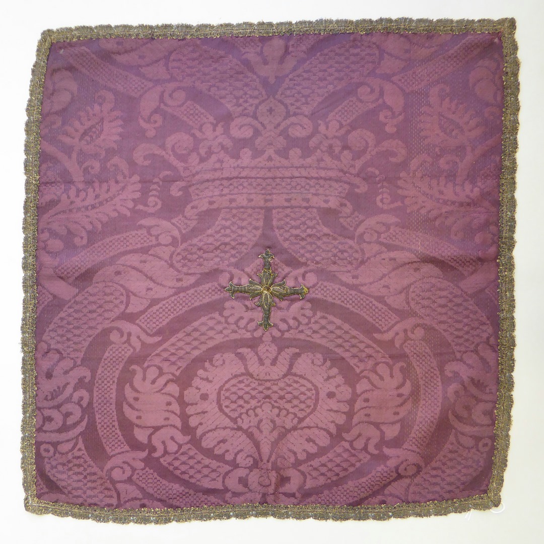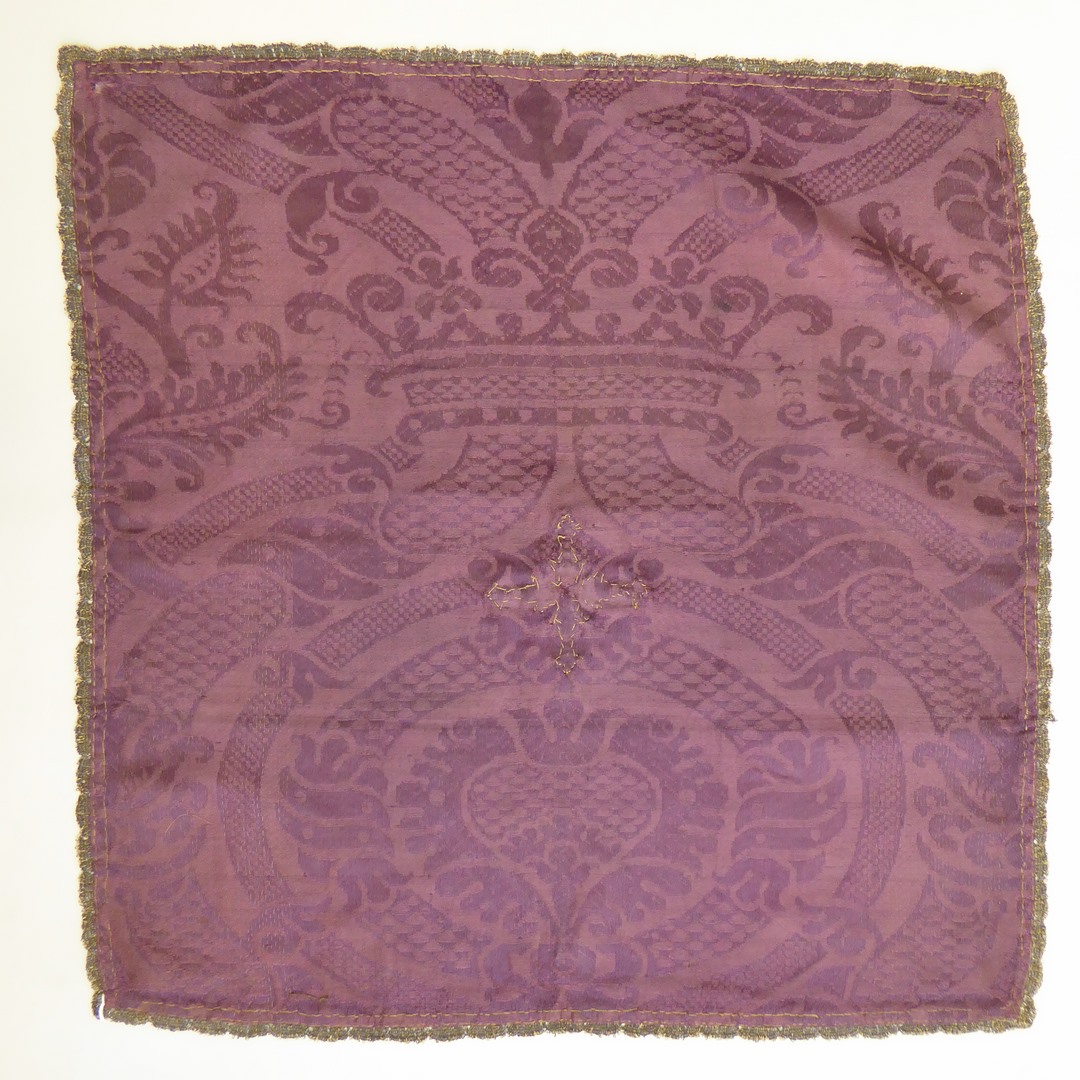 Paars kelkvelum van zijdedamast met patroon van hart in spitsovaal met kroon en Franse lelie, met gehoogd kruisje
