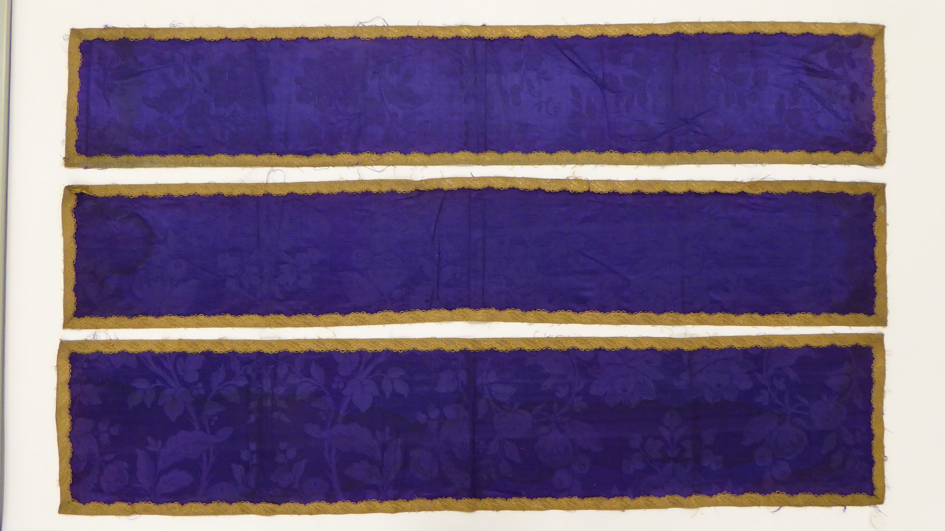 Paarse loper met ingeweven bloemmotieven afgezet met goudgalon